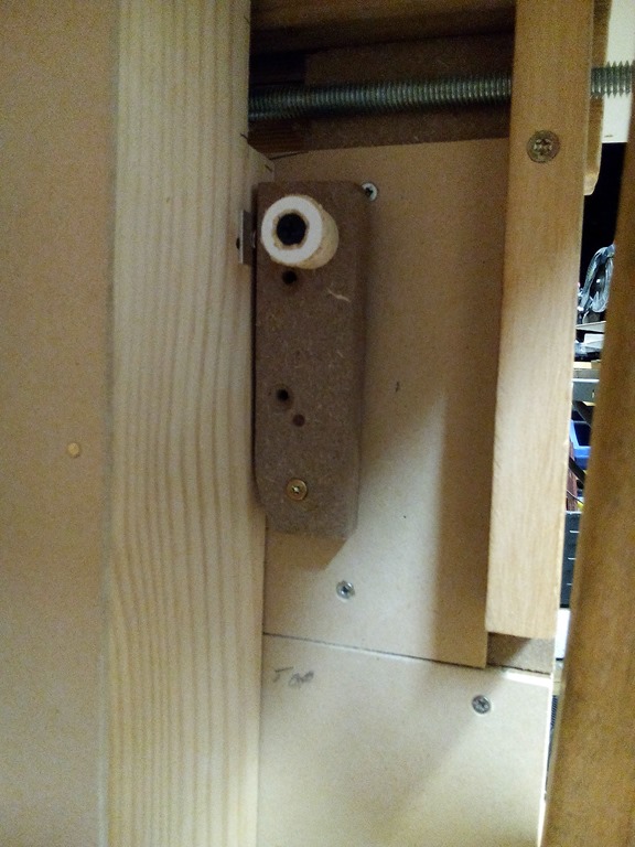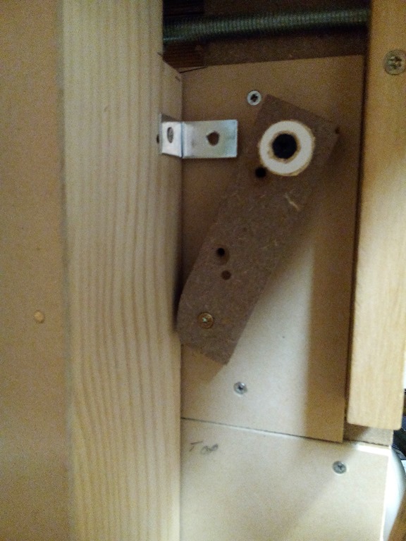 Pondered for a while about a cover lock and came up with the idea to use a small bracket screwed to the side of the cover frame and a pivot arm lock.