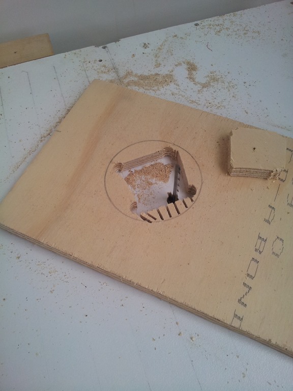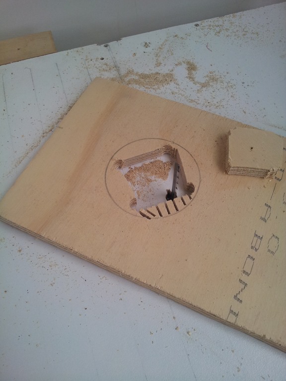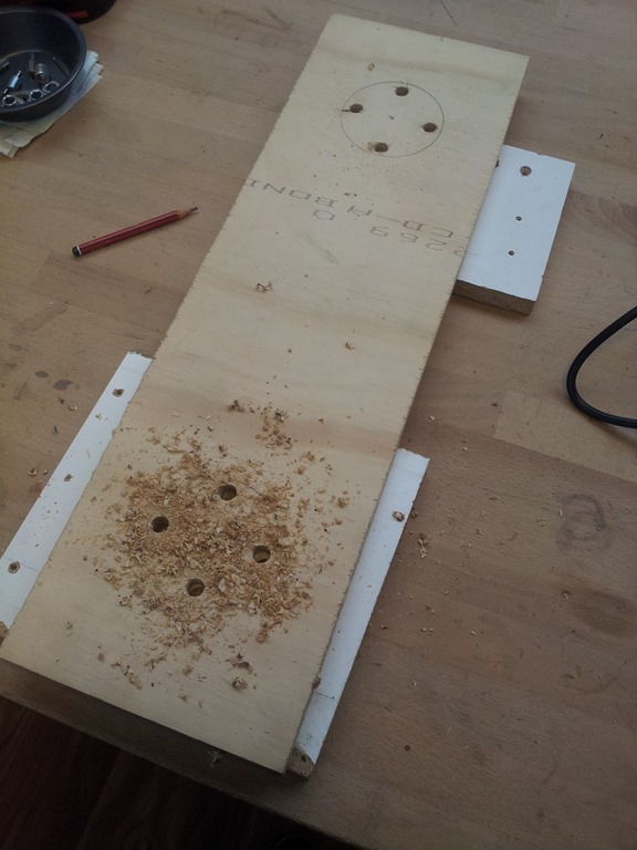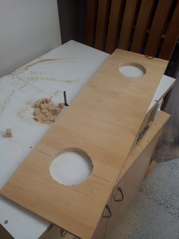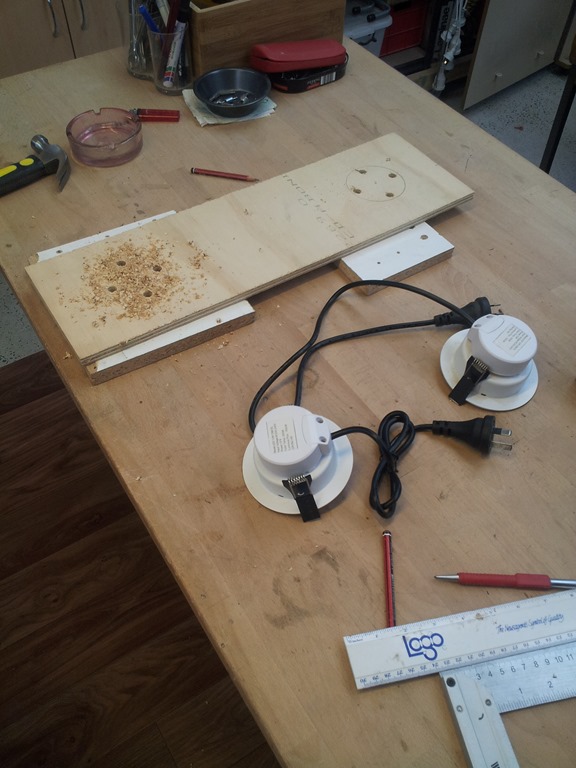 Found a piece of plywood the right size. Light needs a 80mm hole so marked that out at each end and drilled starter holes for the jigsaw table.