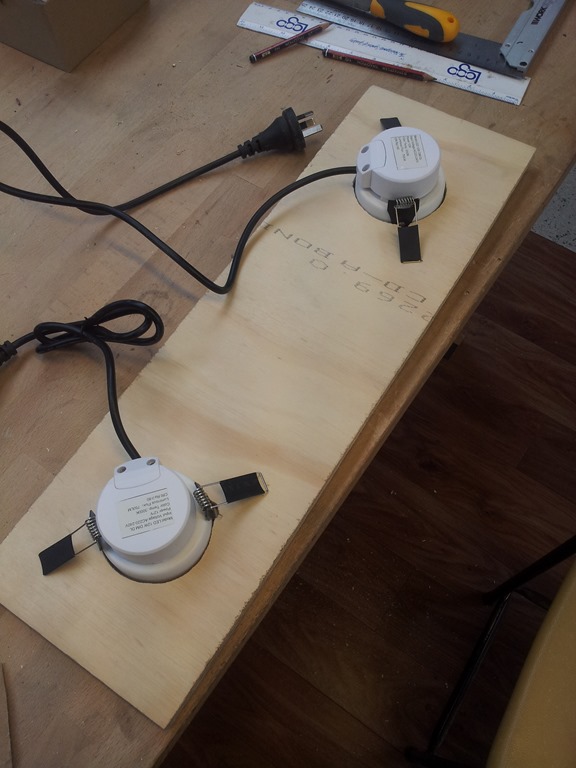 Some time ago bought a couple of LED downlights with 240V plug leads. Finally decided to do something with them – a twin floor lamp. This will stand between the two mitre saws that are parked along the roller door.