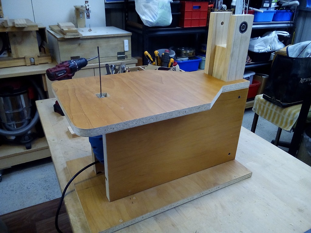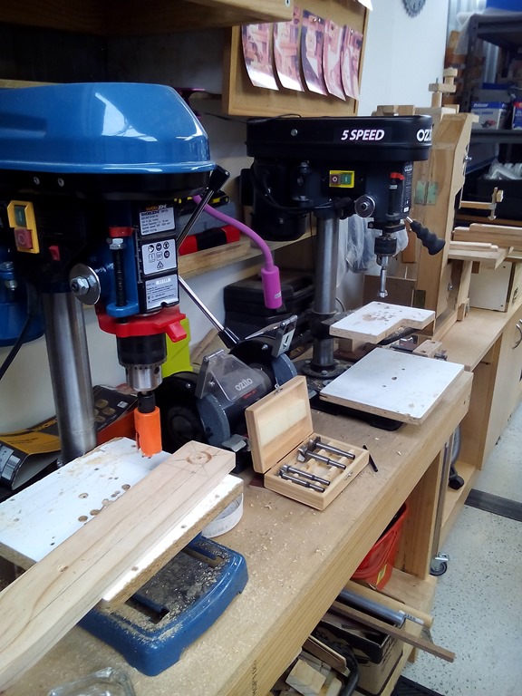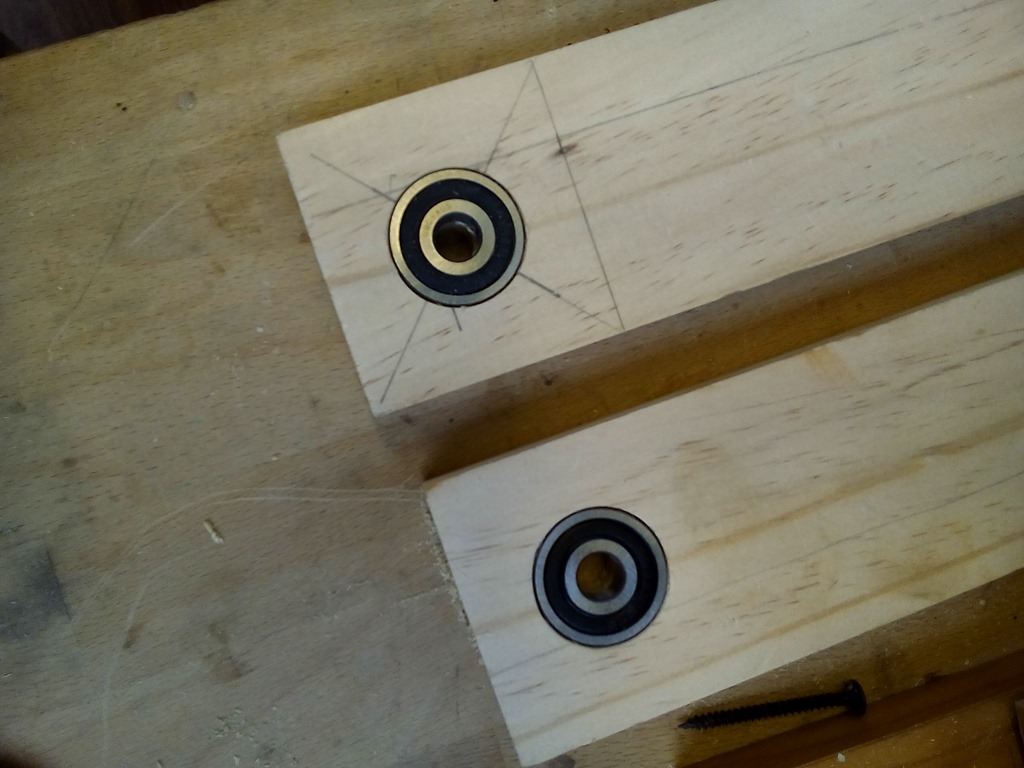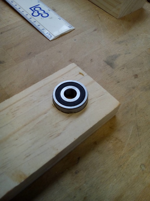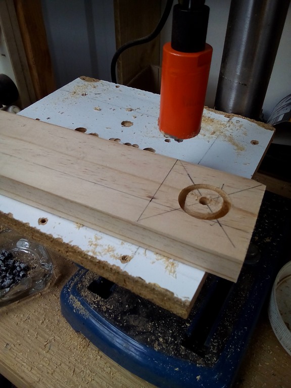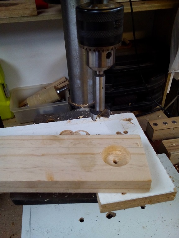 Here we are drilling the 9mm recessed holes with a 29mm hole saw. The bearings are 30mm OD. And now clean out the holes with a 25mm Forstner bit.