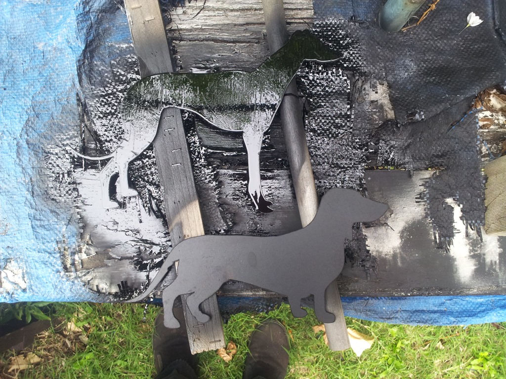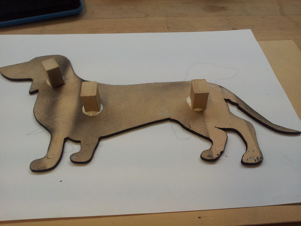 Got some cans of satin spray during shopping yesterday to get this part done. Interesting that the grey is plywood and shiny while the sausage is MDF and dull – and looks better.