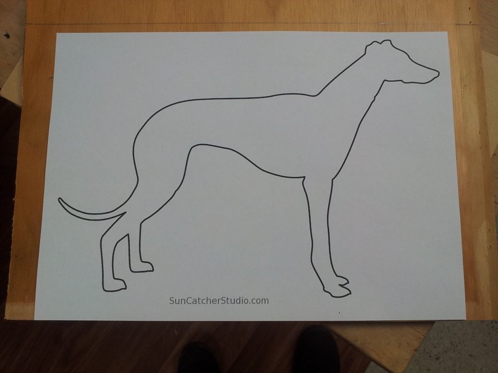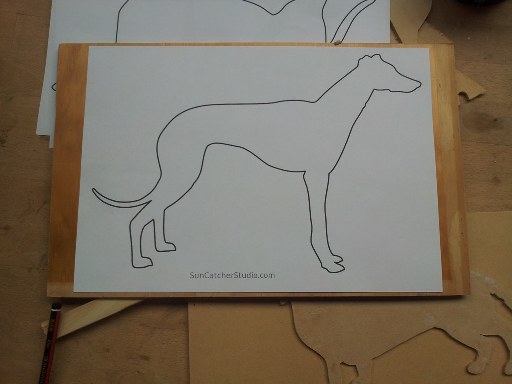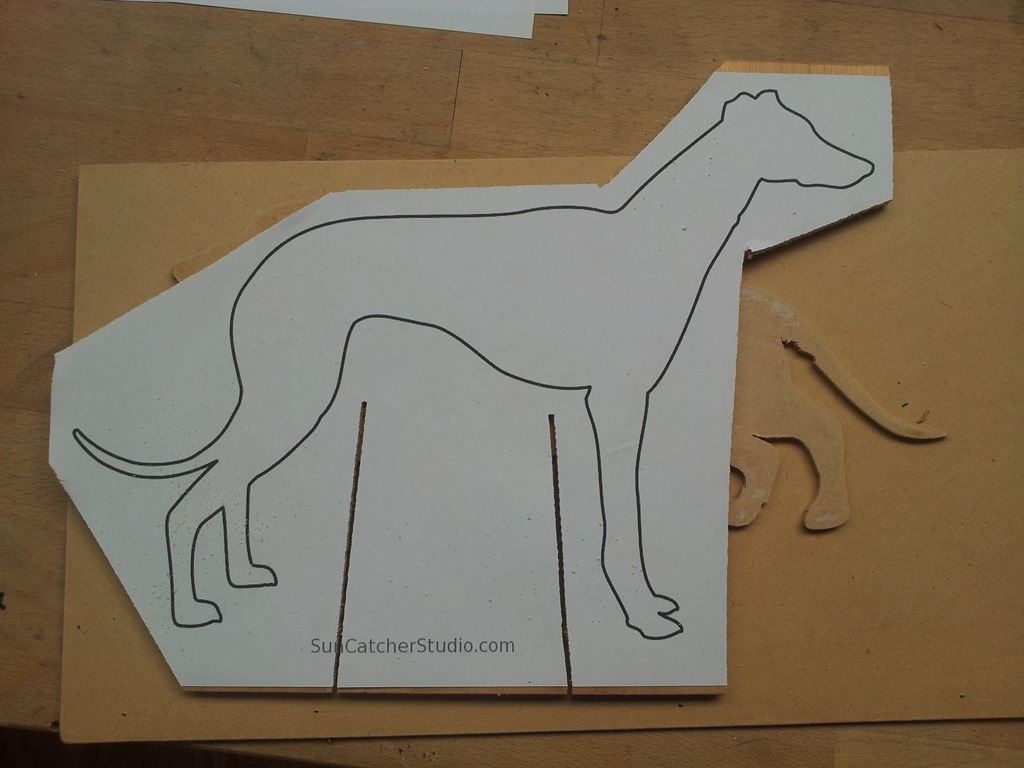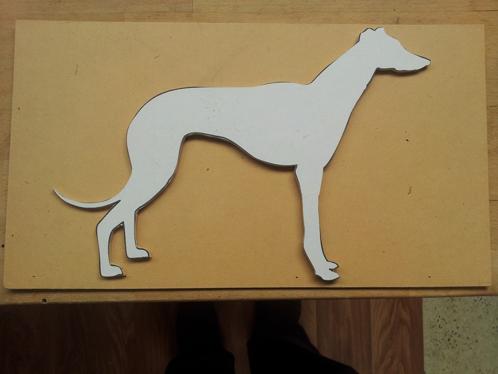 While waiting for the strip lighting kit to arrive, that provides the silhouette effect, and for Alan to get the flat black spray I decided to print, stick and cut another pattern on 3mm MDF – a Greyhound