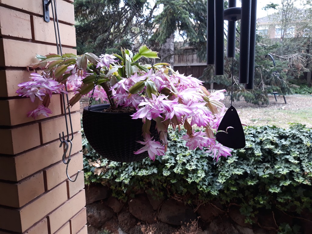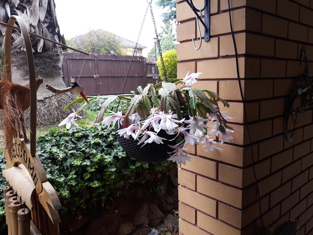 Flowering hanging baskets along the front porch.