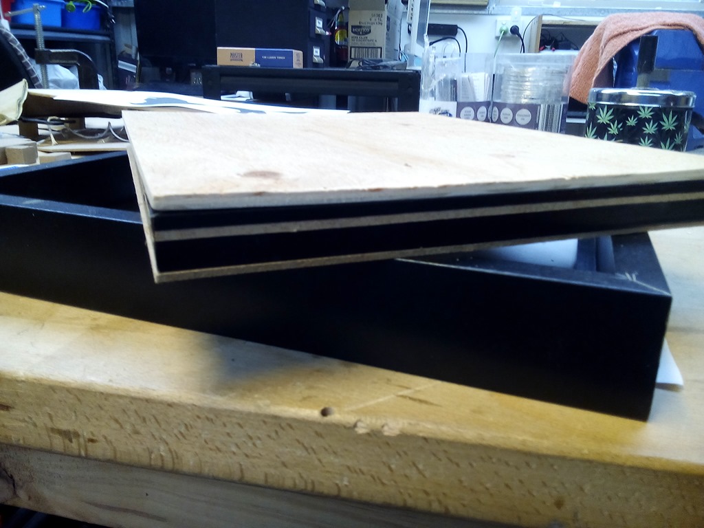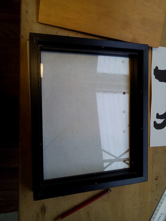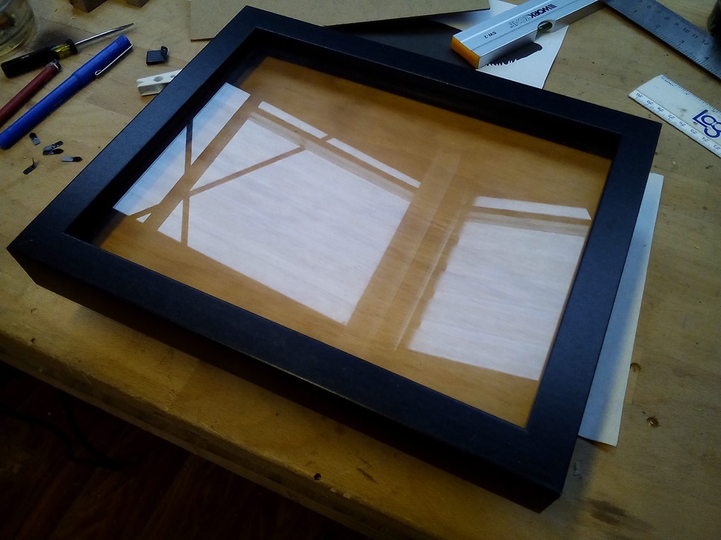Three layers, the top is the plywood base board I just cut in the previous picture. Next is the internal frame supplied with the picture frame. The bottom one is normally the glass but during the build I’ll use the supplied picture backing board.