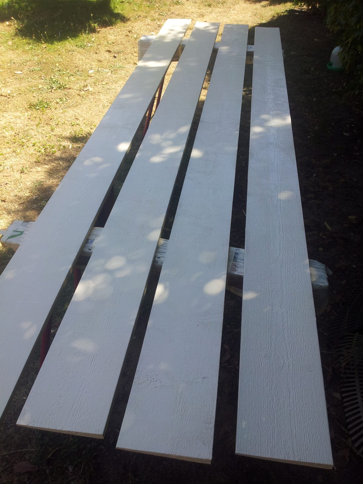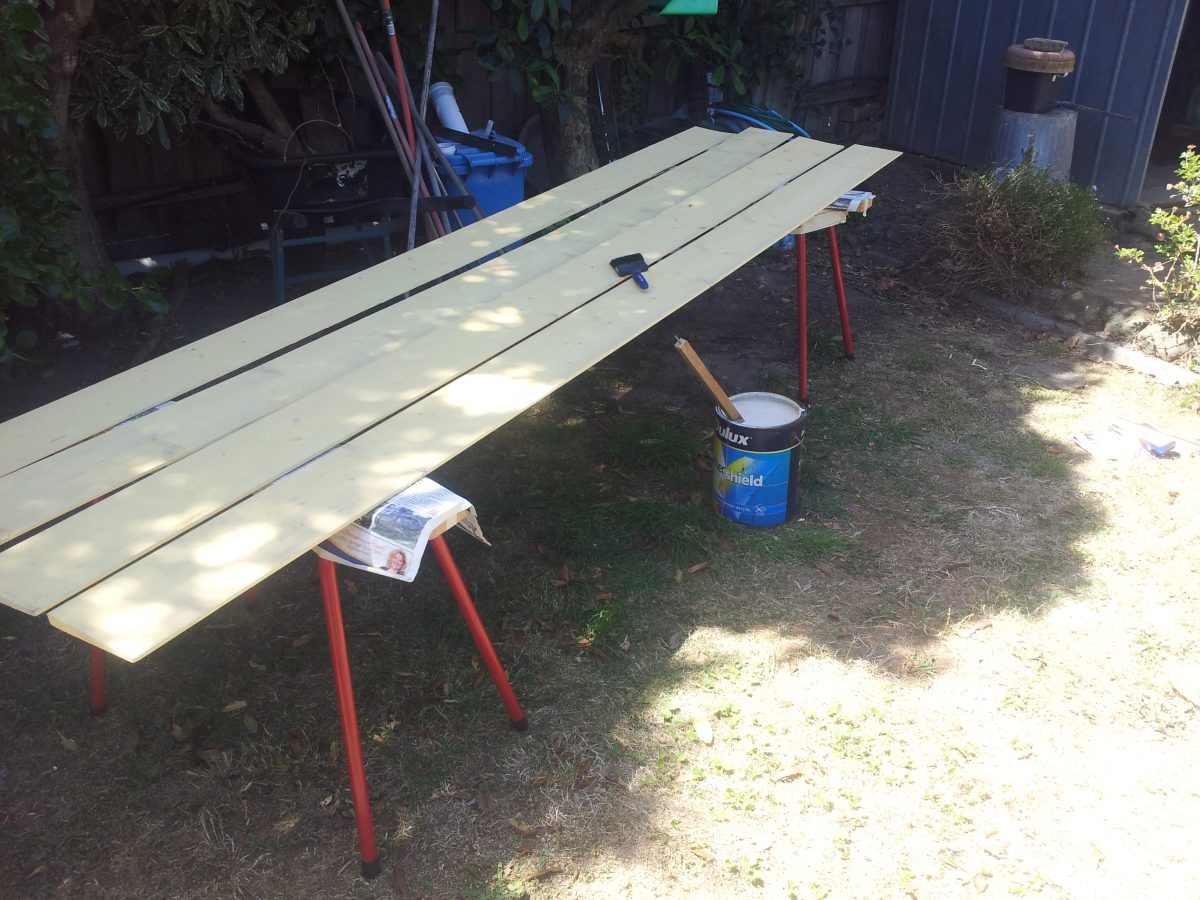 Doing the back of the boards first – two coats. It’s important to do the ends. The boards are 3.0M and when I put them up I’ll trim the ends down to 2.850mm on the cordless mitre saw and dab paint on the fresh ends.