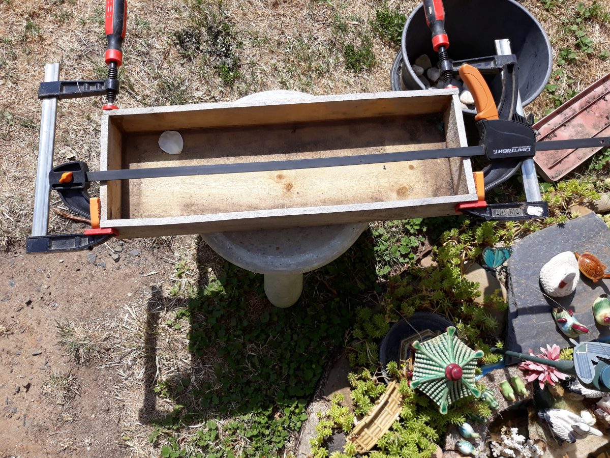 I use fence palings to make all sorts of things, like this pot plant container. Couple of nailed joints coming apart due to warping so squeeze in plenty of wood glue, clamp up and put in some small gauge screws.