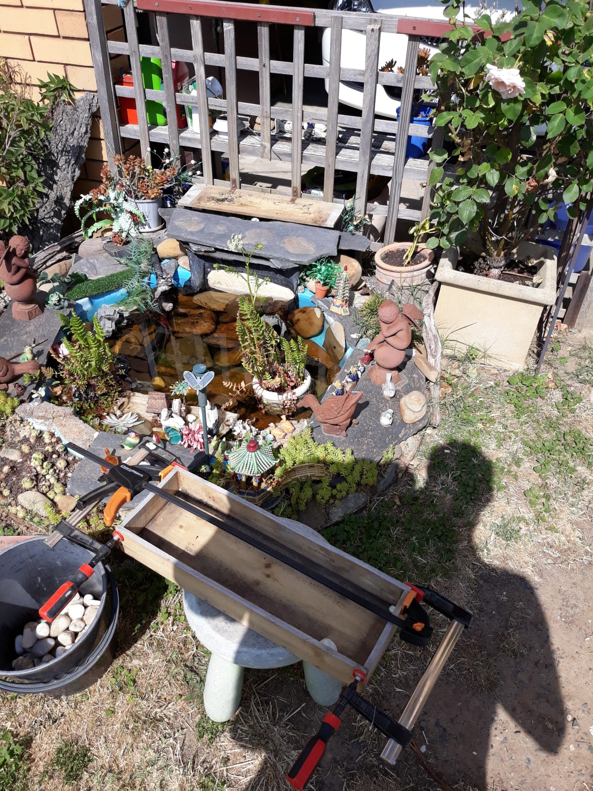 The pot plant container box that I made a few years ago that sits up top at the back of the pond needs fixing.