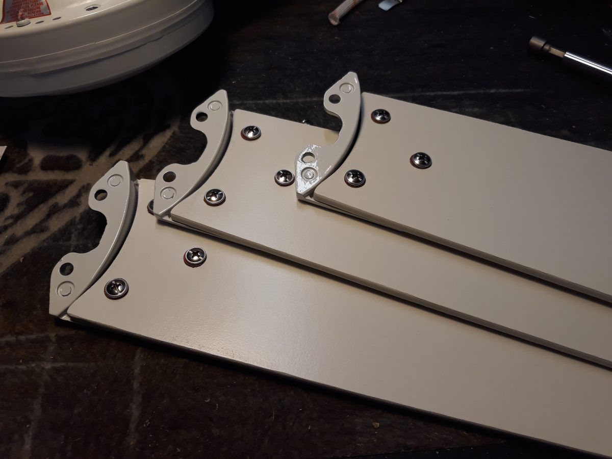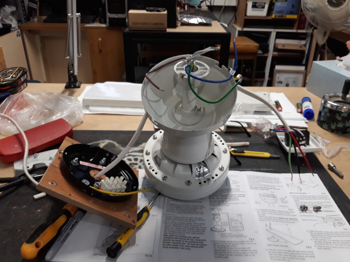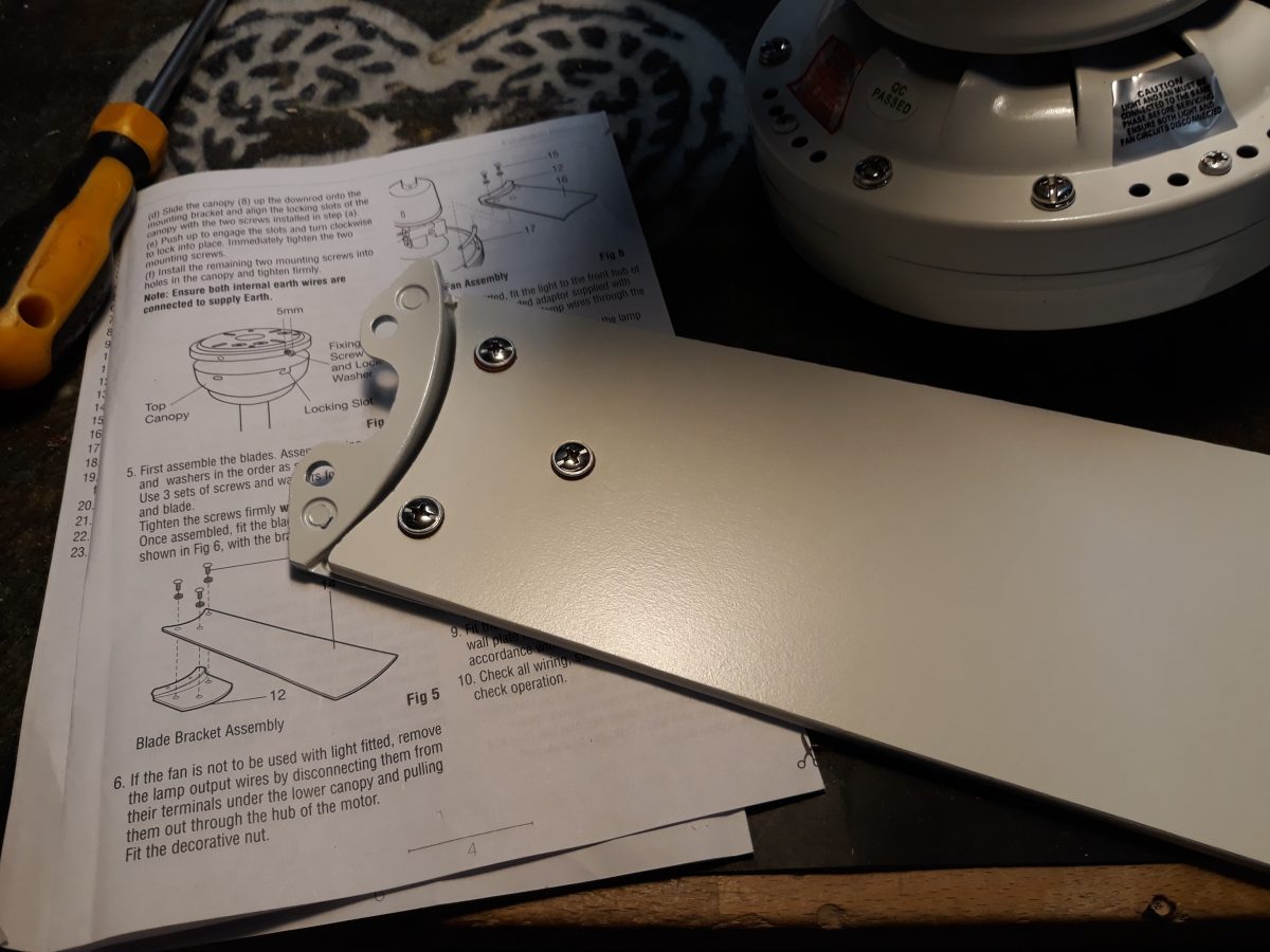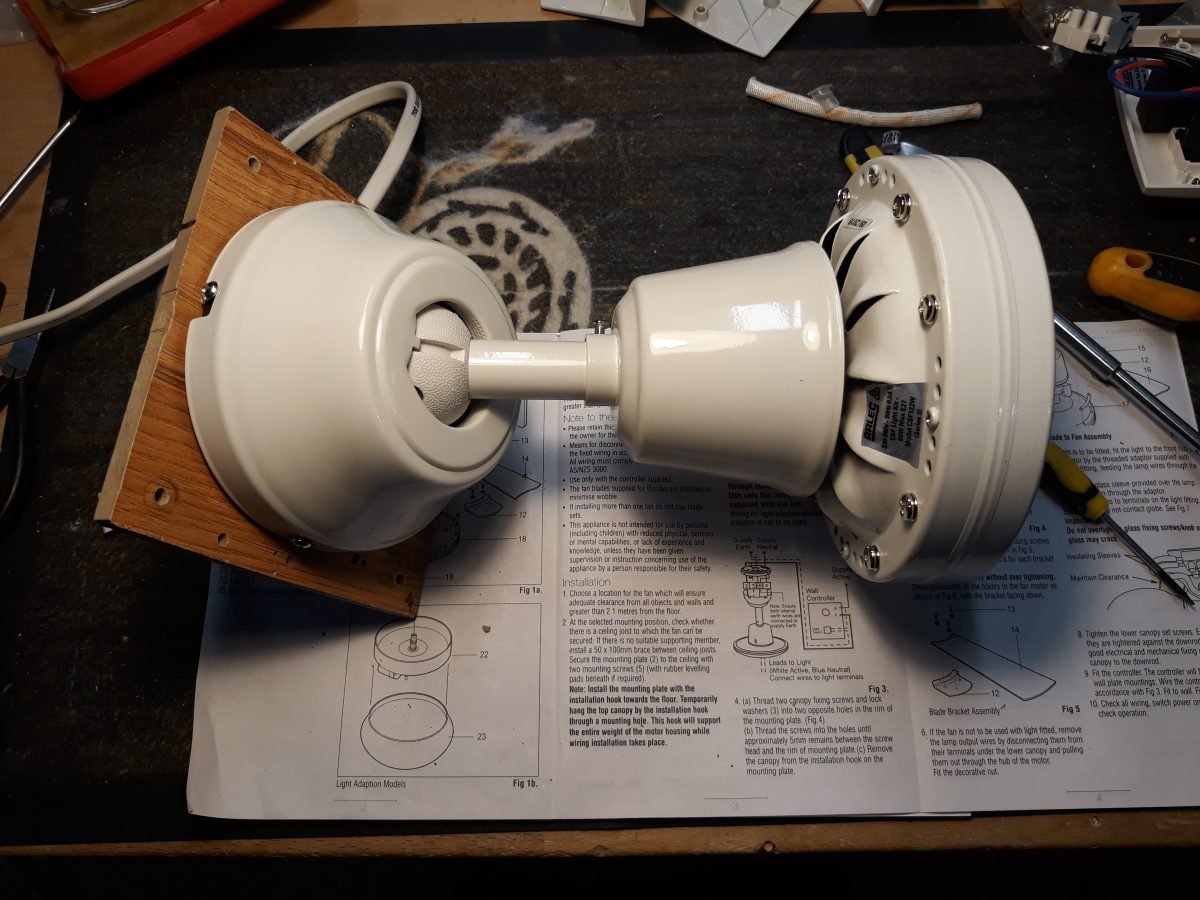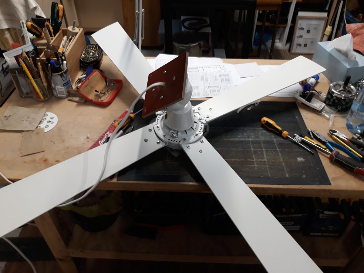 Blades are screwed to the motor housing with a fibre washer between the two. At this point we are ready to go up the step ladder but enough for now…back soon.