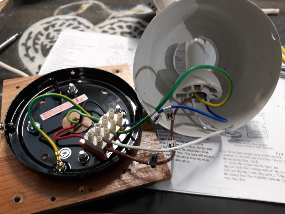 The instructions say to first fix the base mounting plate to the ceiling. There is a hook on the base plate to which you can hang the fan which frees up both hands to do the wiring – nice touch.