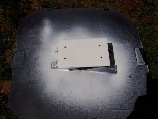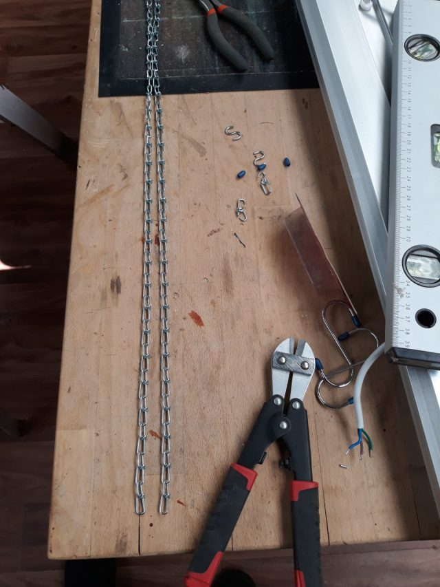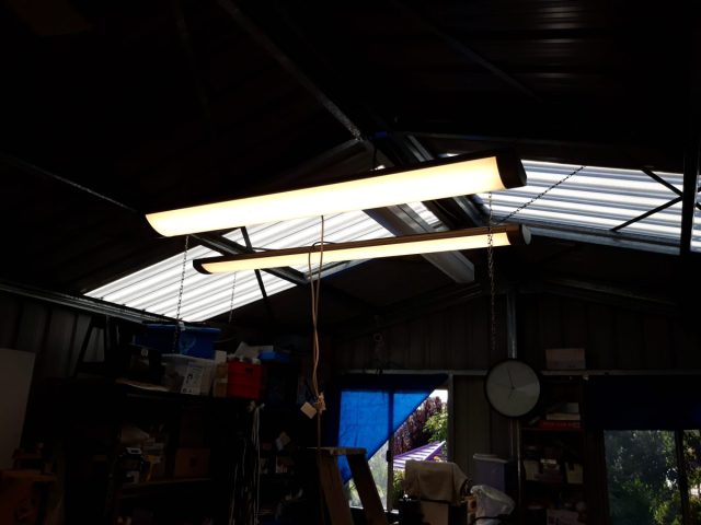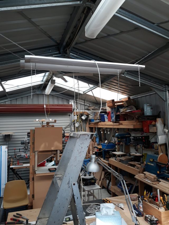 From the last session sprayed the MDF plate gloss white and while that was drying started hanging the LED Fluro lights over the workbench.