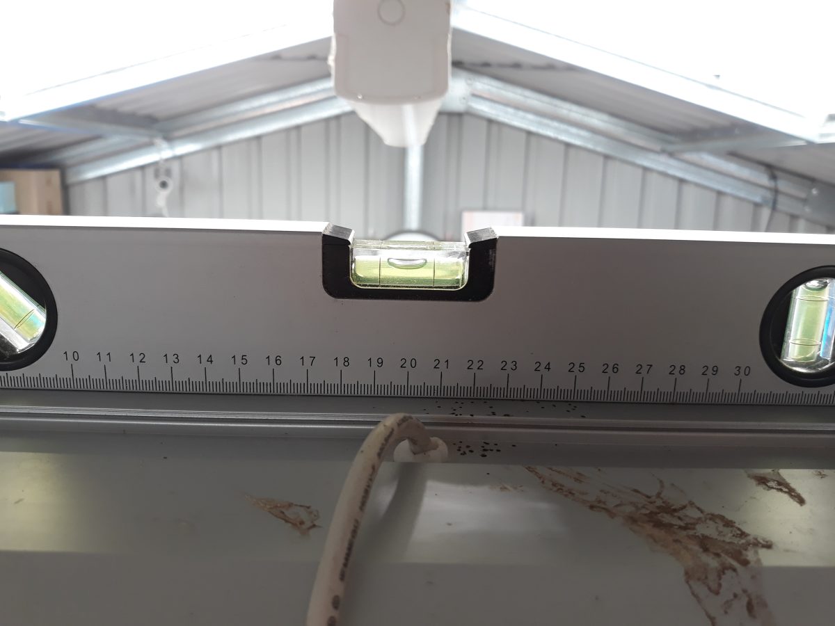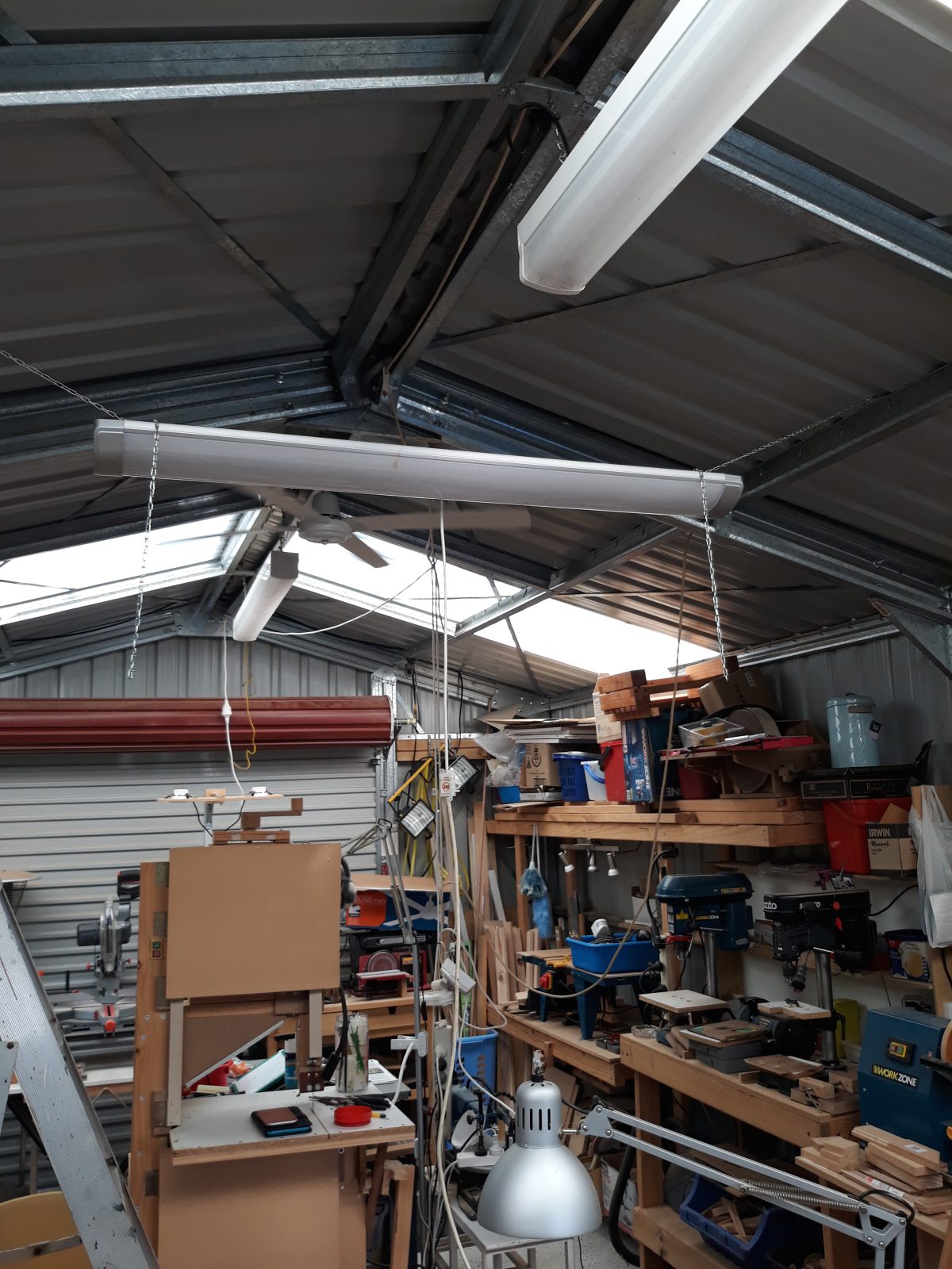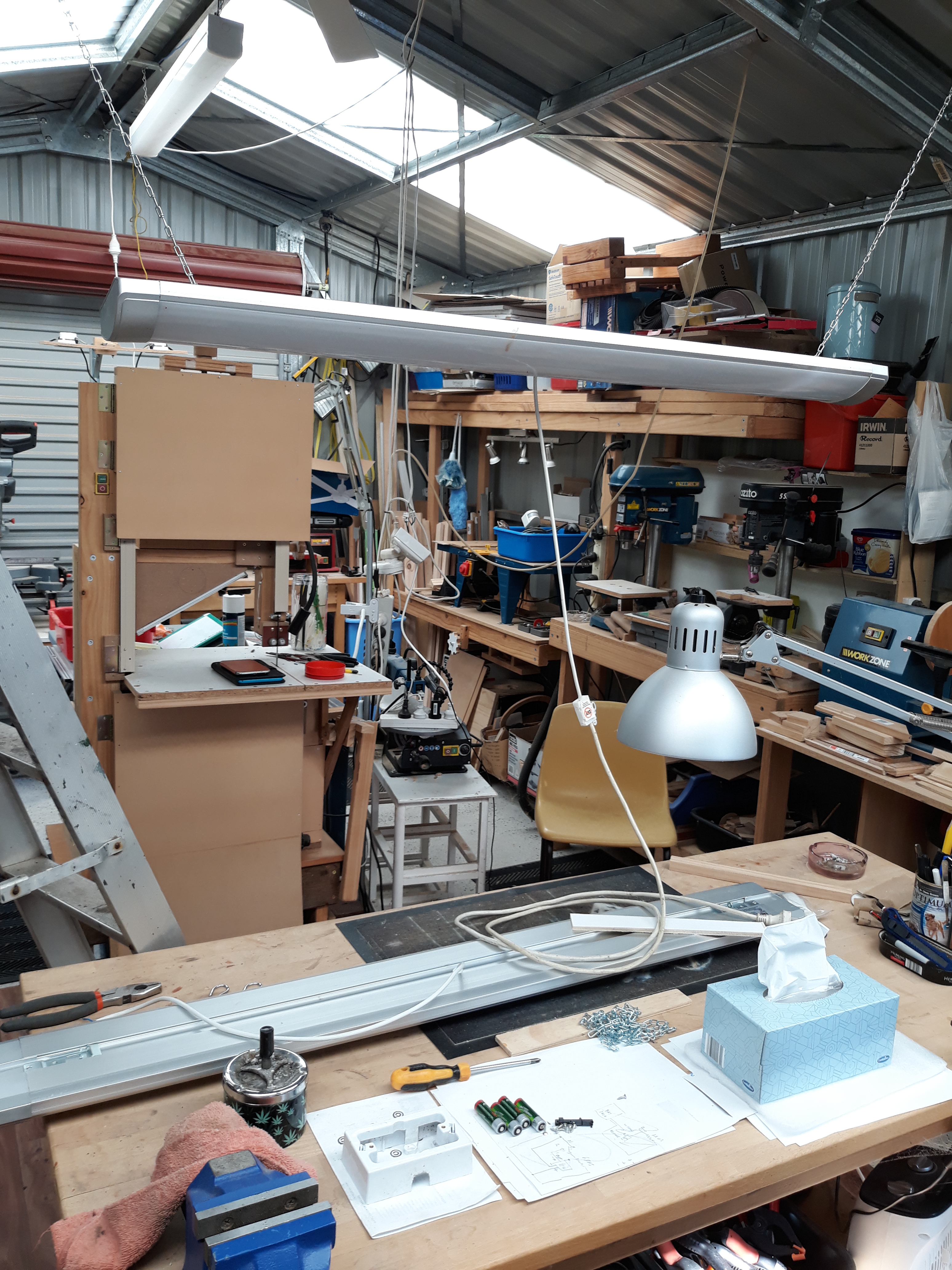 From the last session sprayed the MDF plate gloss white and while that was drying started hanging the LED Fluro lights over the workbench.