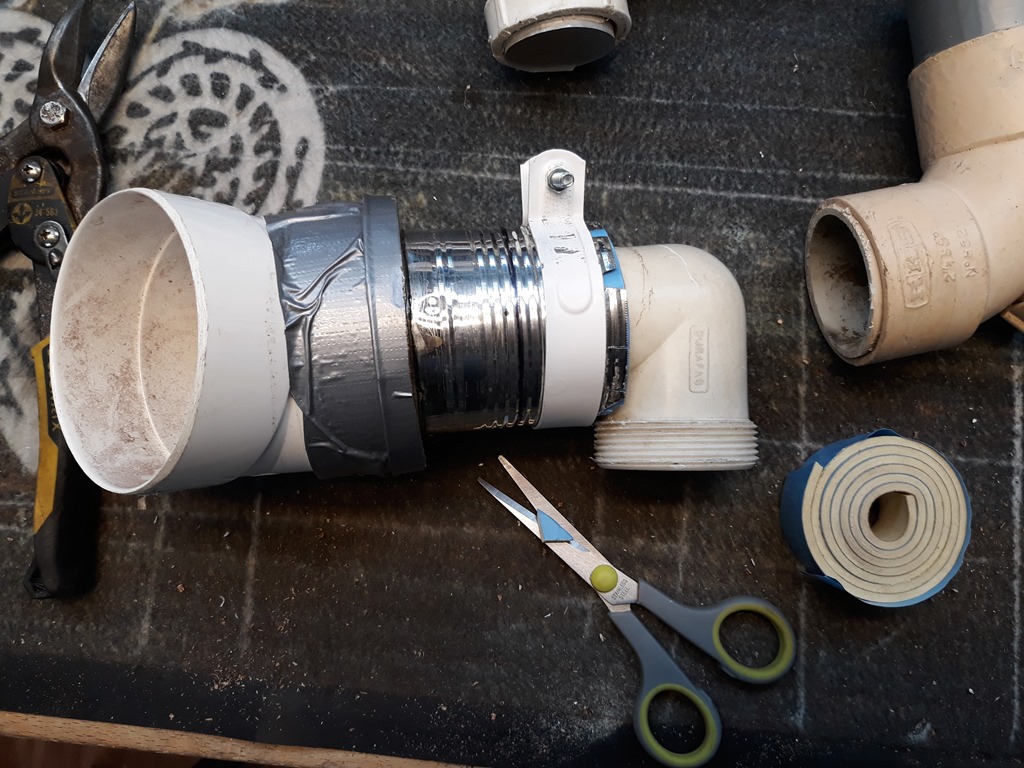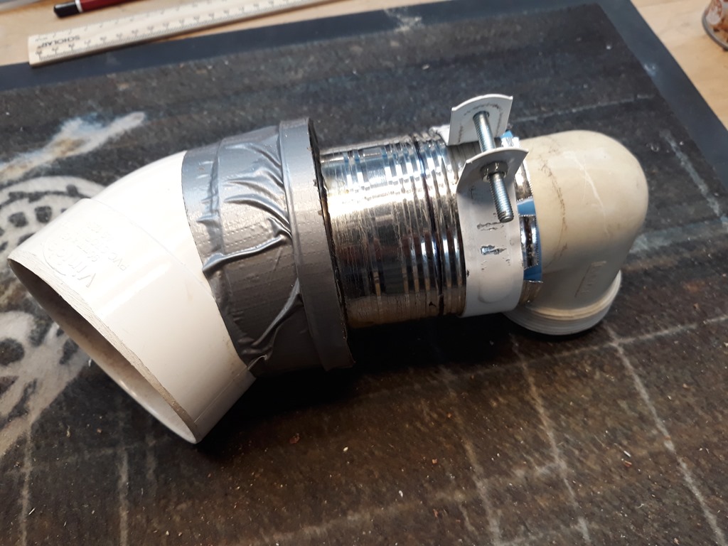 Modified a pipe clamp for the output end and used some double-sided foam tape (only one side peeled off) for a neater more leak proof connection. The angle is now easily adjusted.