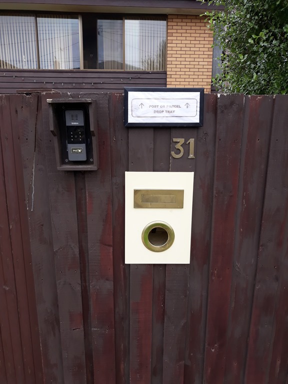 System is working well hand appears over fence with slow release of package into dish washing tray then press of video intercom button followed with wave to ET who is usually on the balcony.