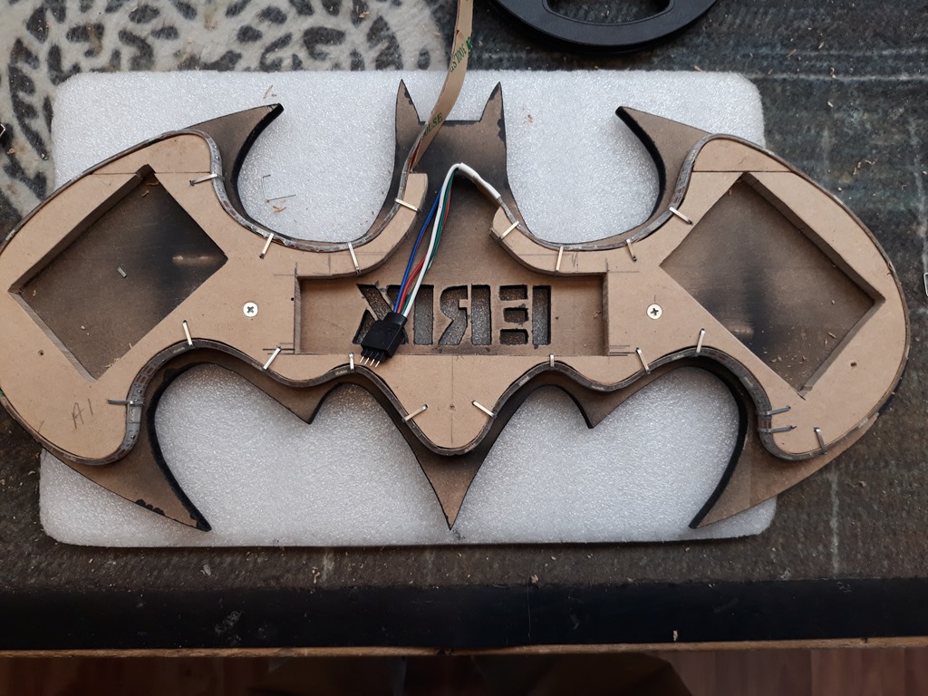 Off we go…using standard T50 8mm staples to fix the LED strip to the MDF contour. Note that I DO NOT remove the backing which allows for shuffling the strip back and forth where they converge near the bat head and besides all that it not stick very well to MDF.