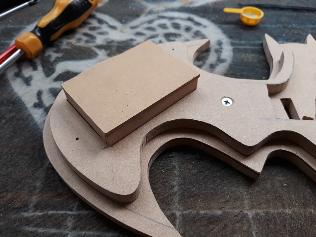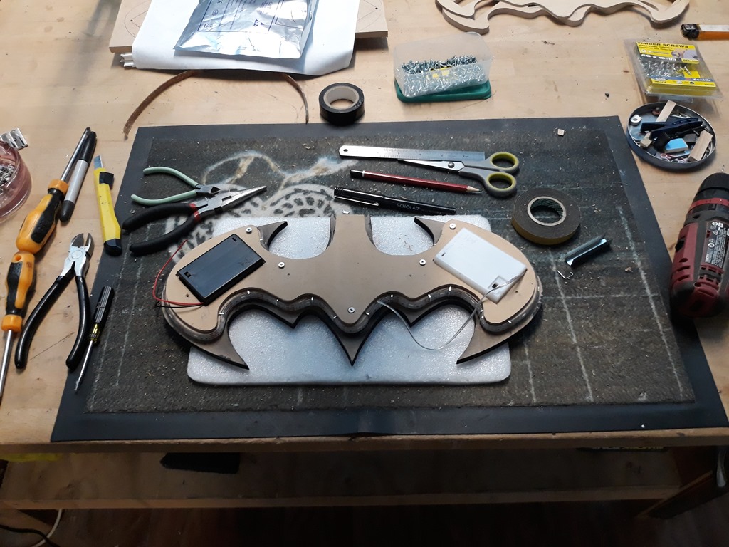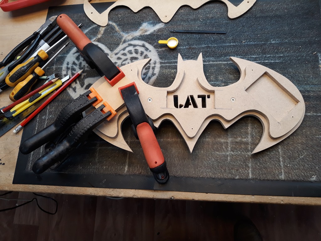 There is no room to mount the 3 x AA battery box in the centre of the back and…have it recessed to reduce the depth because there is LED strip in there to illuminate the name letters. The only spot is on one of the wings which would unbalance the light so I have opted for a 2nd (dummy) battery box that holds three spare batteries – on the other wing.