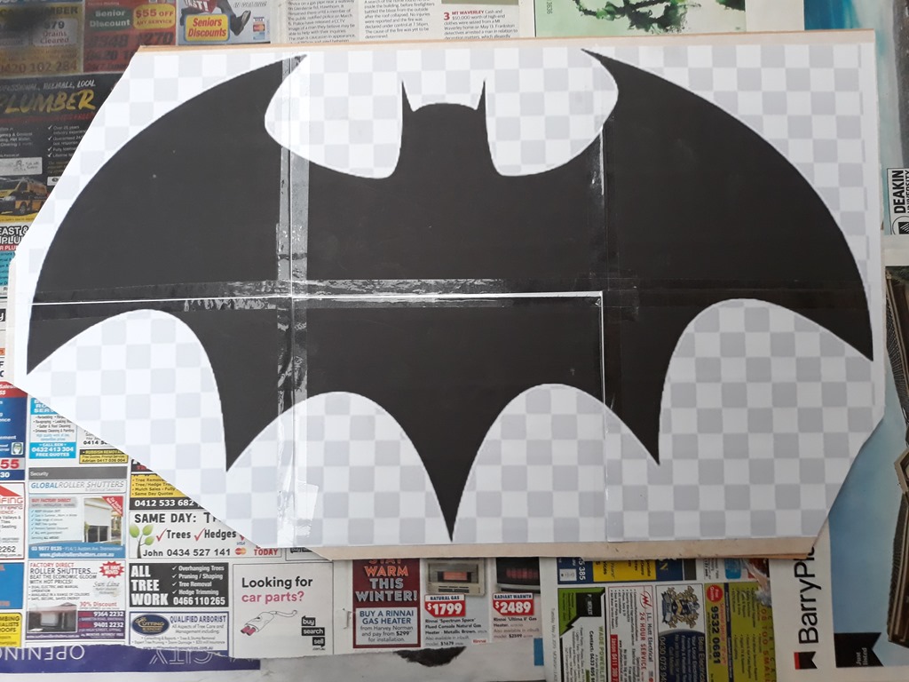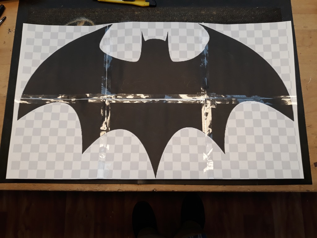 Stuck onto the MDF bland ready for cutting out on the scroll saw. Hmm…might be to big for that may have to use the jigsaw table.