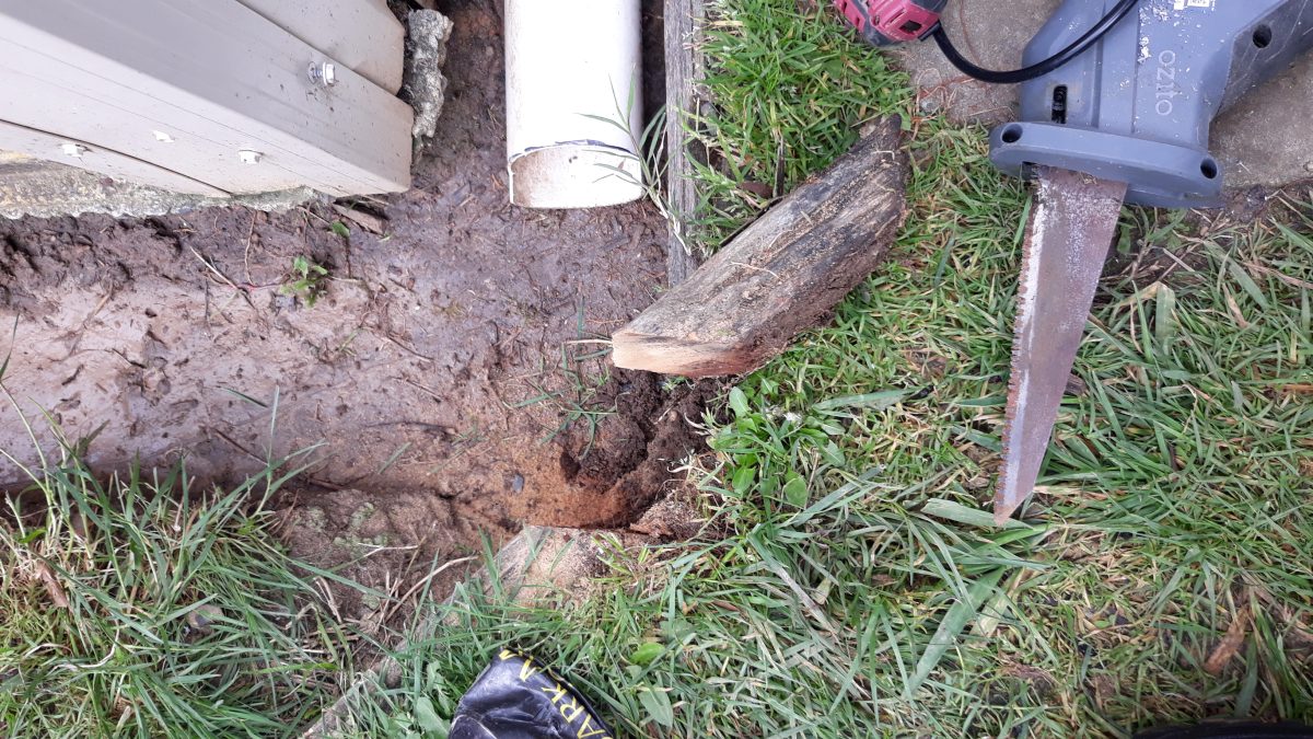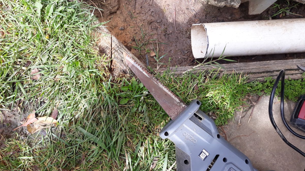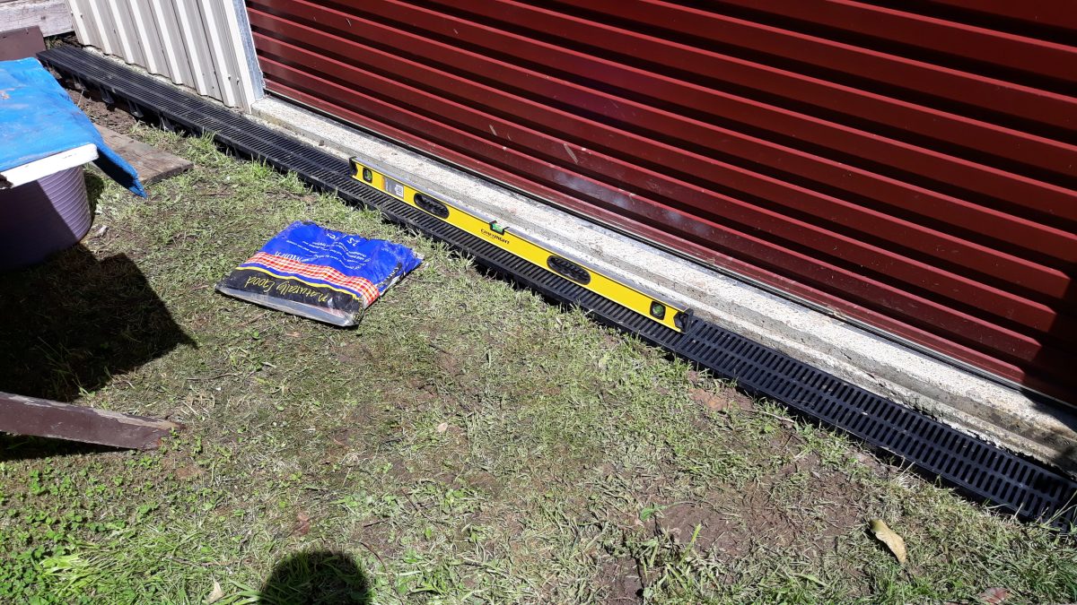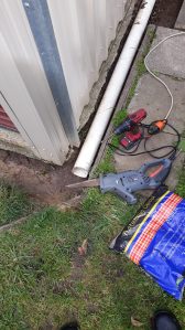 More kneeling… need to cut out the end of that angled timber so the drain corner can line up with the PVC pipe.