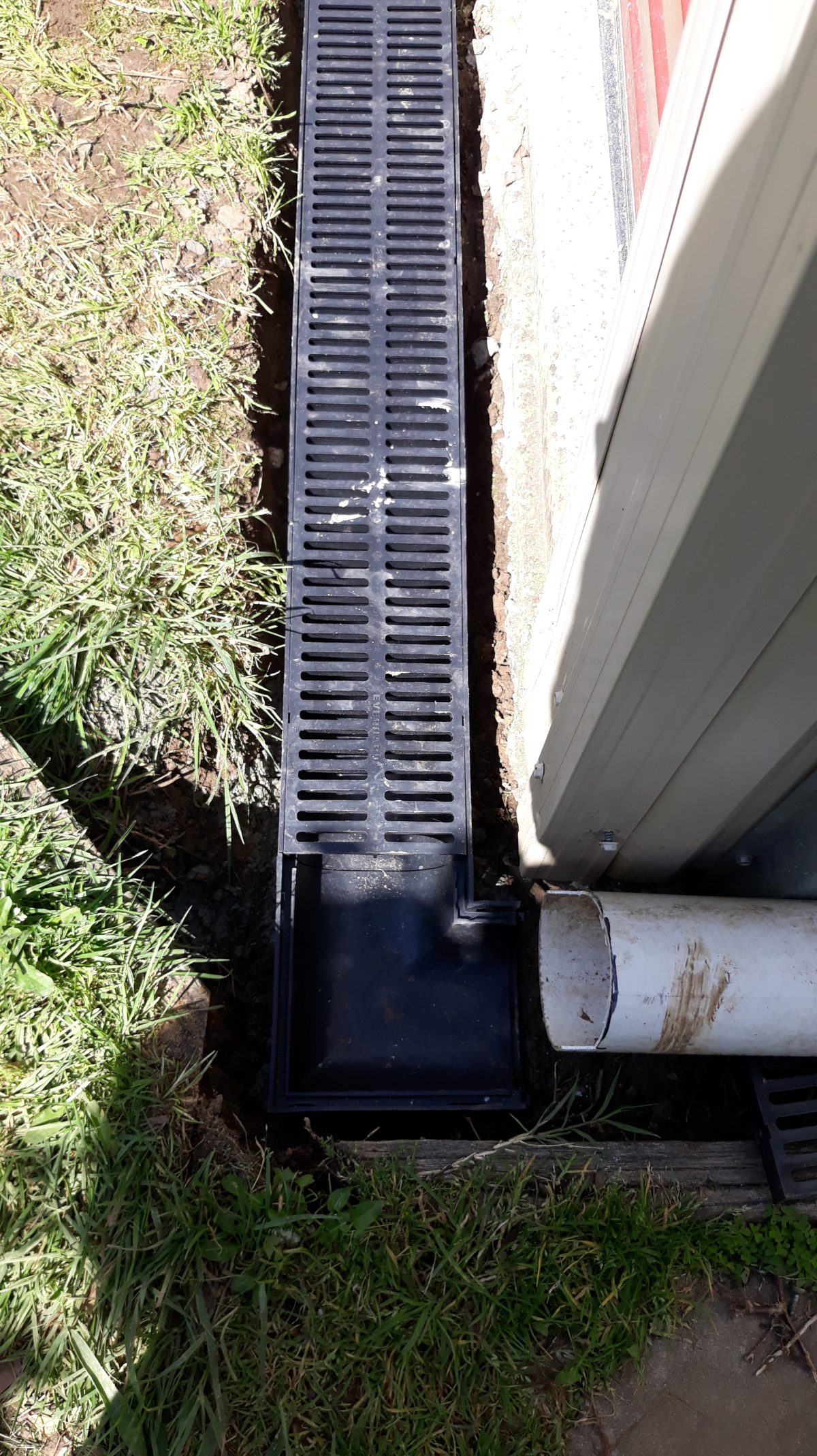 The right or chook run side where it will connect to 90mm PVC via a corner grate.