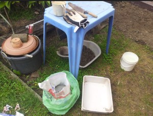 Mixing up some mortar in a spare chook tray bed which is actually a kitty litter tray screwed to a chipboard base. I say ‘spare’ because we only have one chook left (Speckles) all the others are gone.