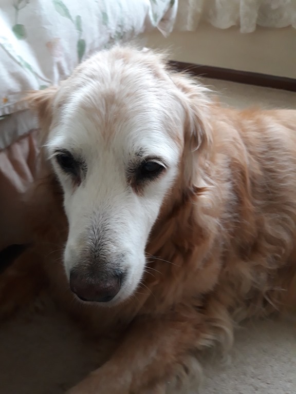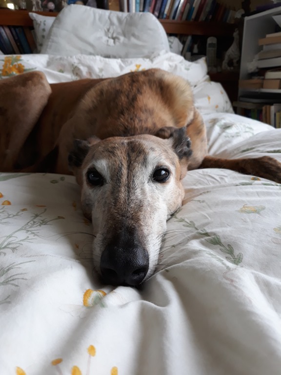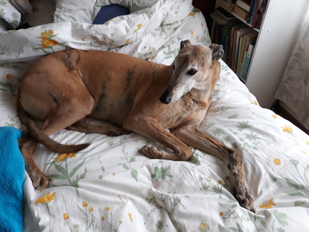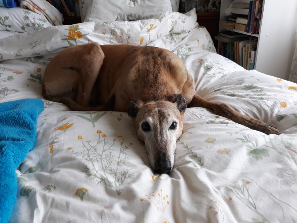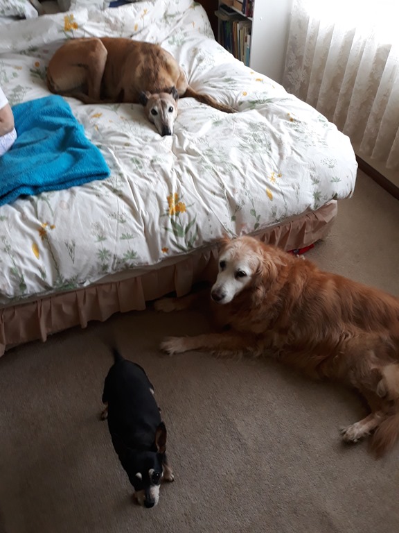Sprocket on the bed with Pixie and Holly.