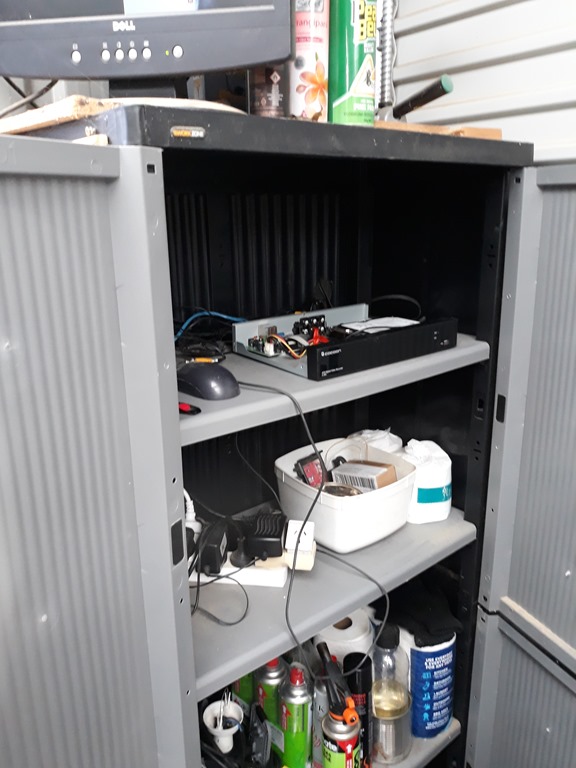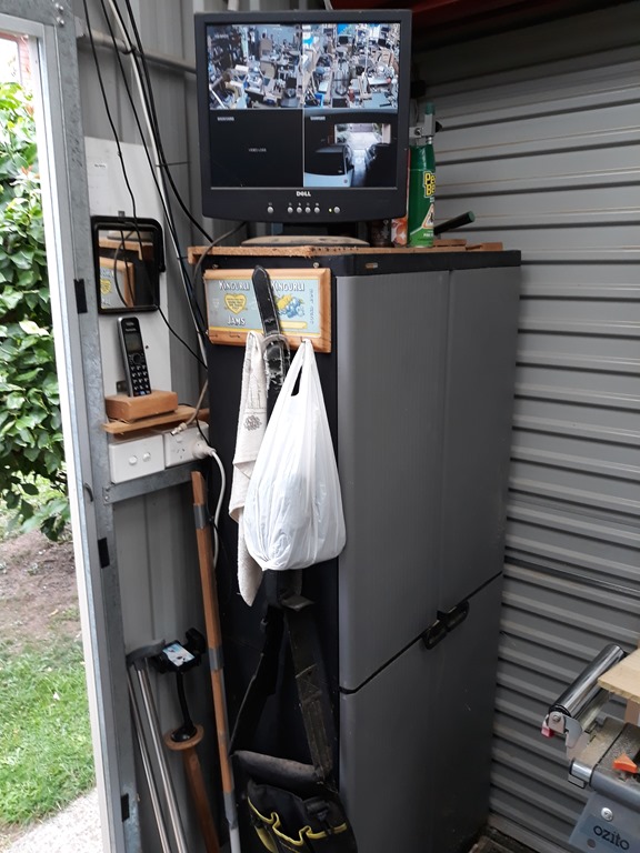 The DVR is located in this cupboard near the side entrance with an old Dell LCD monitor on top. Channel 1 & 2 are the workshop cameras. Channel 4 camera looks down the carport and up the driveway. This one full screen allows me to keep an eye on things when home alone. Channel 3 is general purpose outside camera usually on a makeshift camera stand (old windmill base) that I move around as needed.