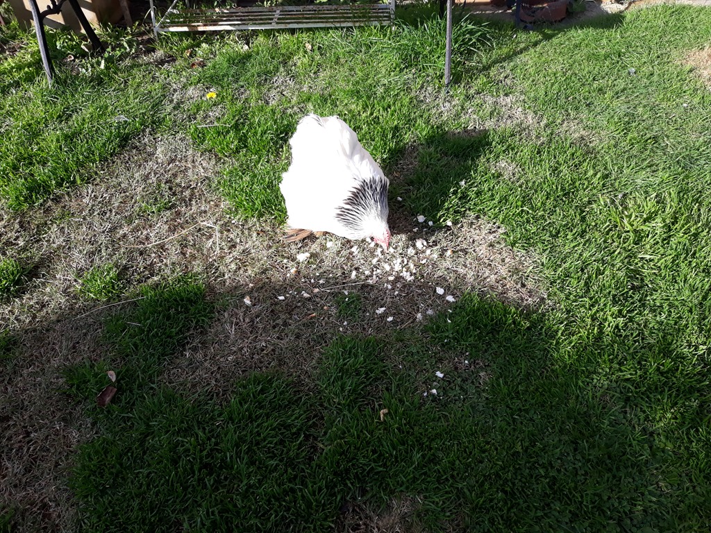 Speckles having a bread treat after I brought her out from the laundry this morning.