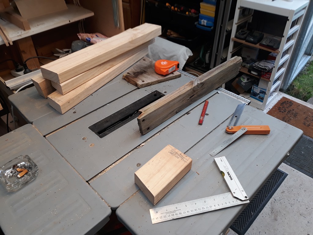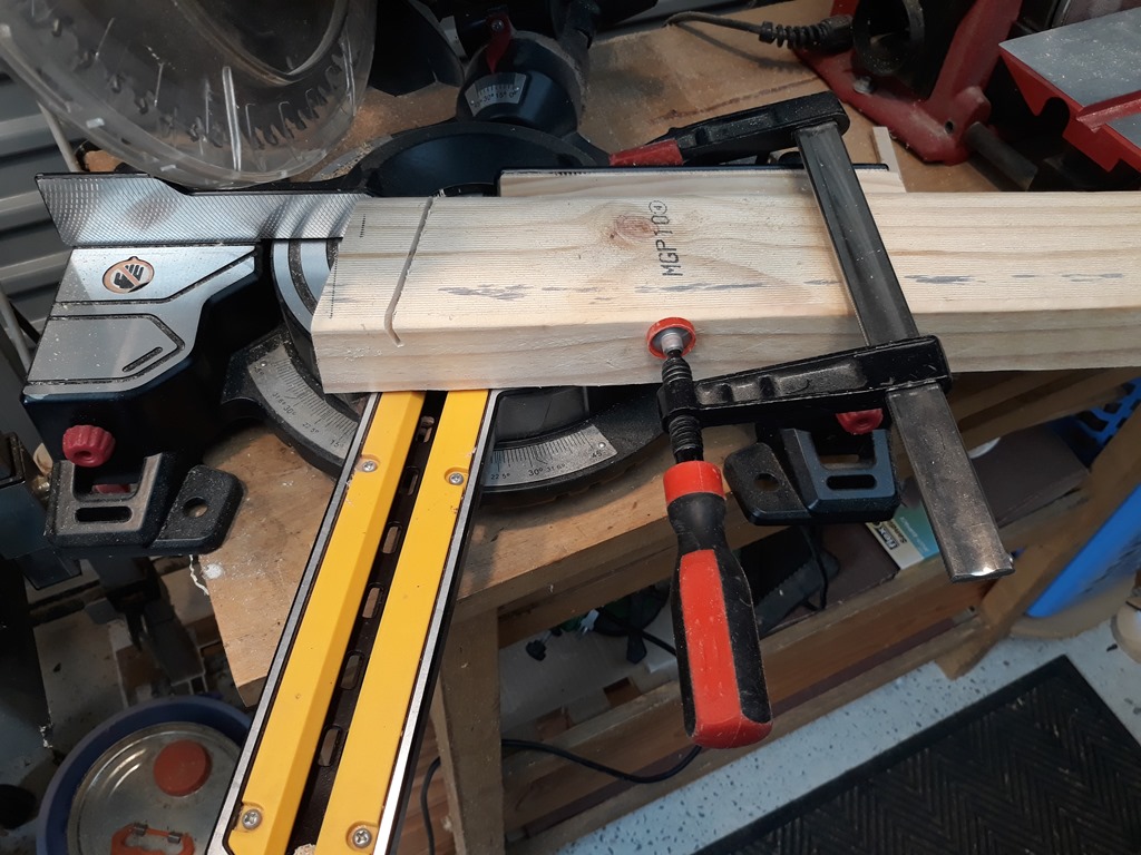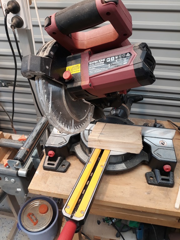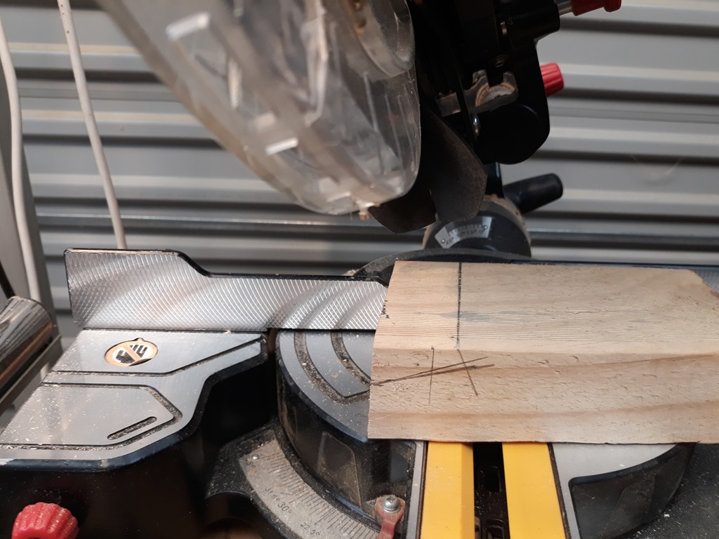 Cut a 2.7m length of pine into four pieces on the 12″ mitre saw.