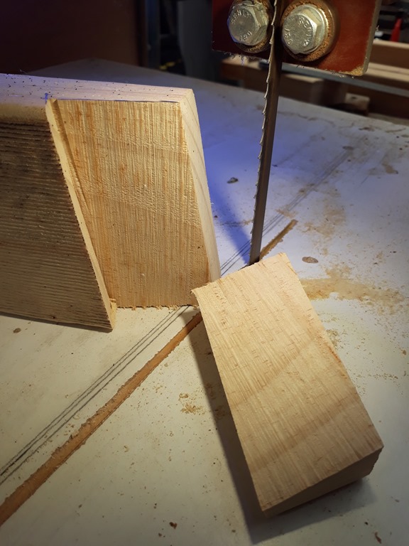 I did the first two with a handsaw and here doing the same thing on the 14″ bandsaw which came out OK. Back soon…