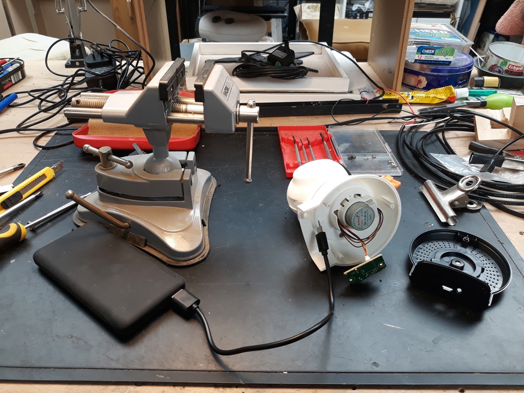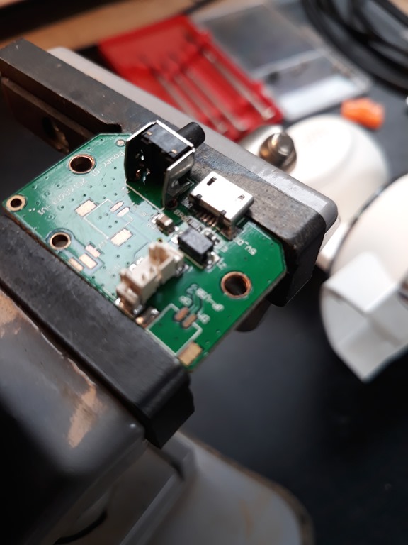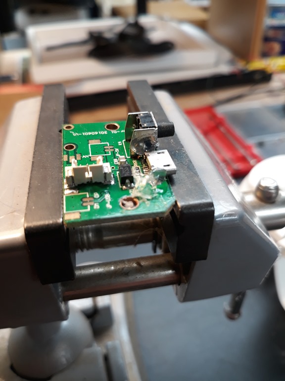 Removed the base and the USB PCB socket dropped out onto the work bench. – the tiny mounting legs have broken off. No photo of the actual socket as it’s too small (bloody tiny) for the phone camera to focus.