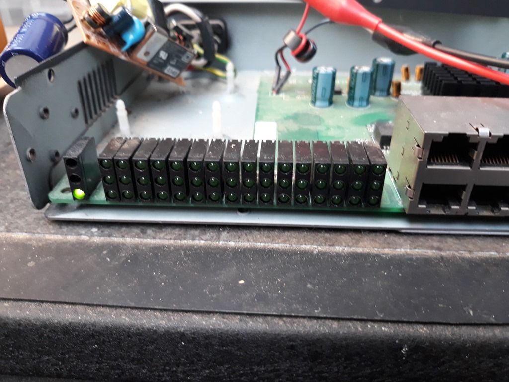 From 2004 – 2019 this was our main switch located in the upstairs linen cupboard. When it died I had a go at repairing the power supply but gave up and it was replaced with a Netgear switch. The photo below is was taken in 2019 photo when the switch died.