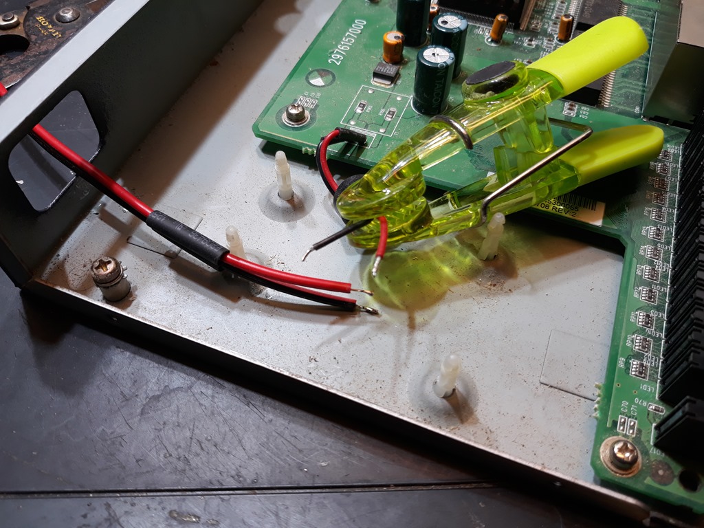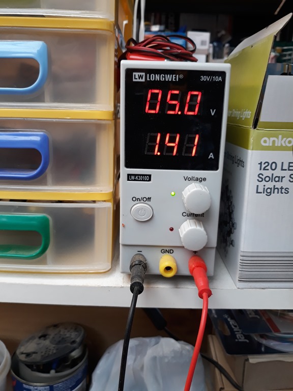 Soldered the connections and powered up the switch – nothing. The male to female is a mismatch, the pin is to small. Used hook-up clips to get it working and the 5V/2A that I found does not have enough grunt. Start again…