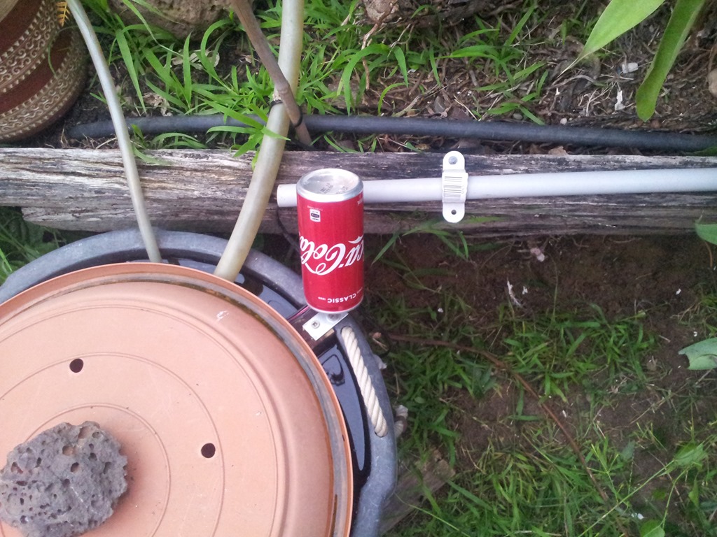 The wires for the 12V water pump and run-dry float level are terminated with wire nuts, and poked into a mini coke can that is held in place with a thin bamboo stake.