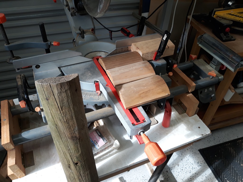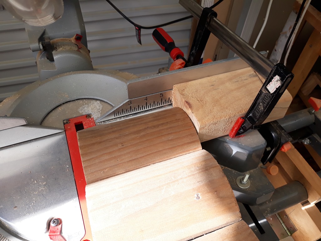 Setting up the 12″ mitre saw with a stop block at 150mm.