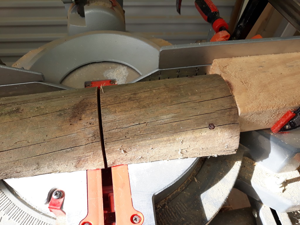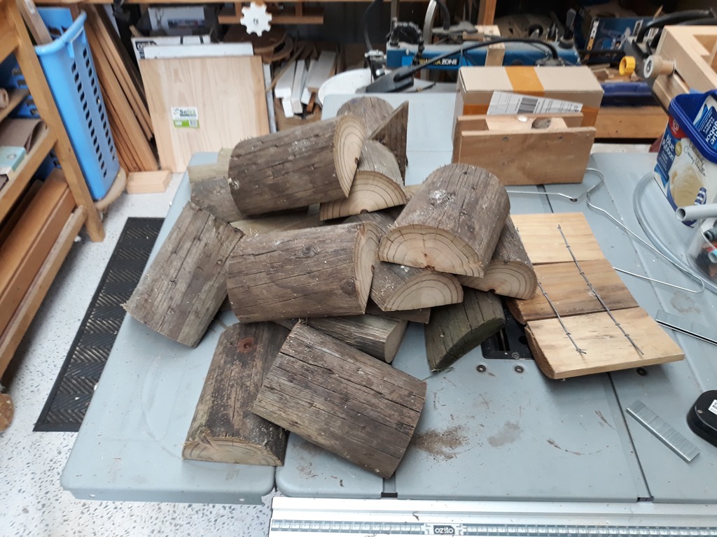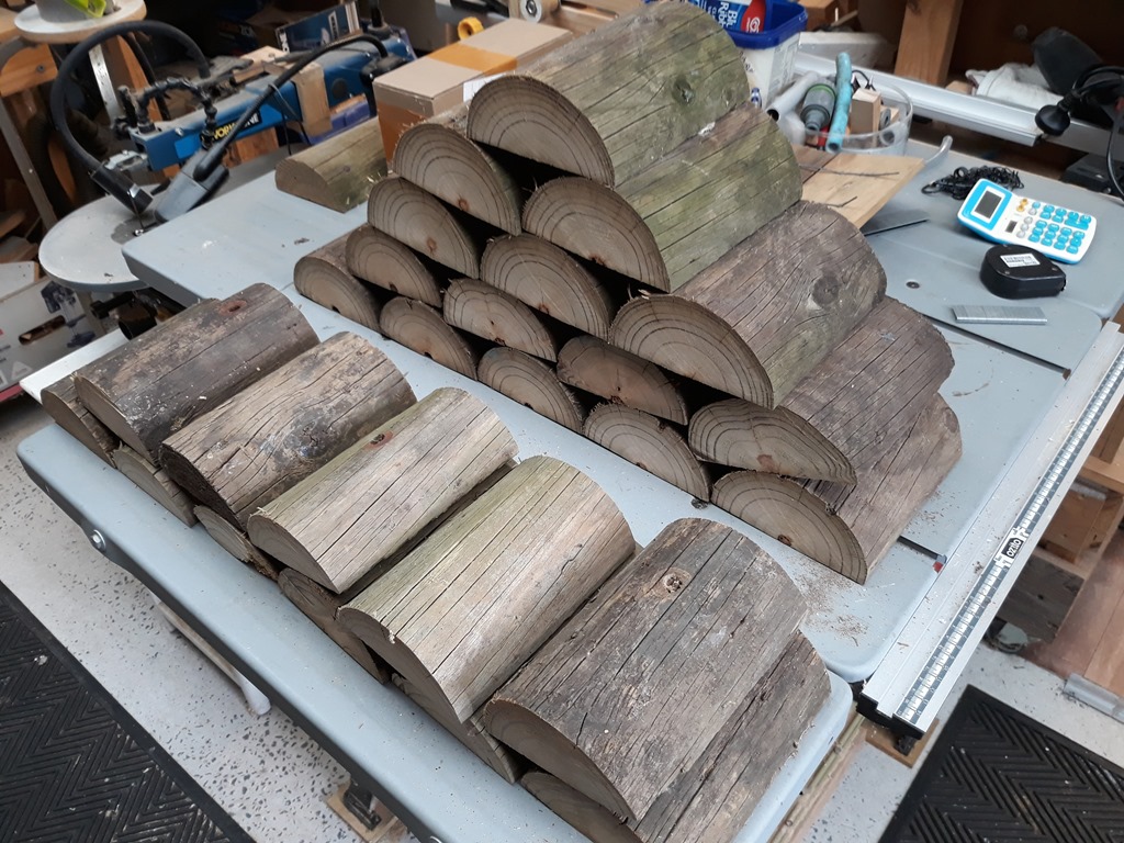 One of the pine poles is a bit smaller in cross section so we have two sizes. Here the larger ones at the back. That’s fine we’ll stagger the smaller ones to create a rustic effect.