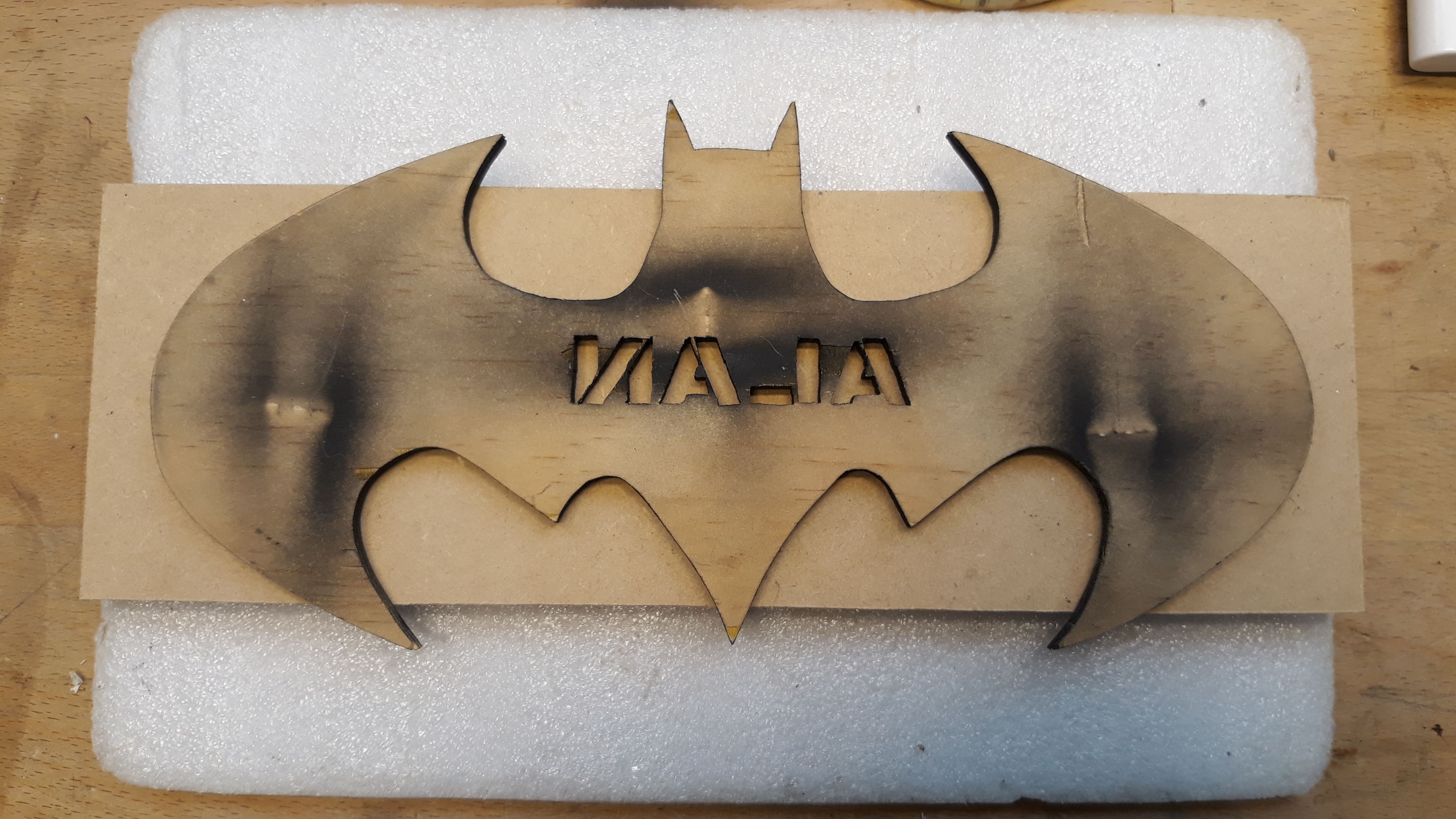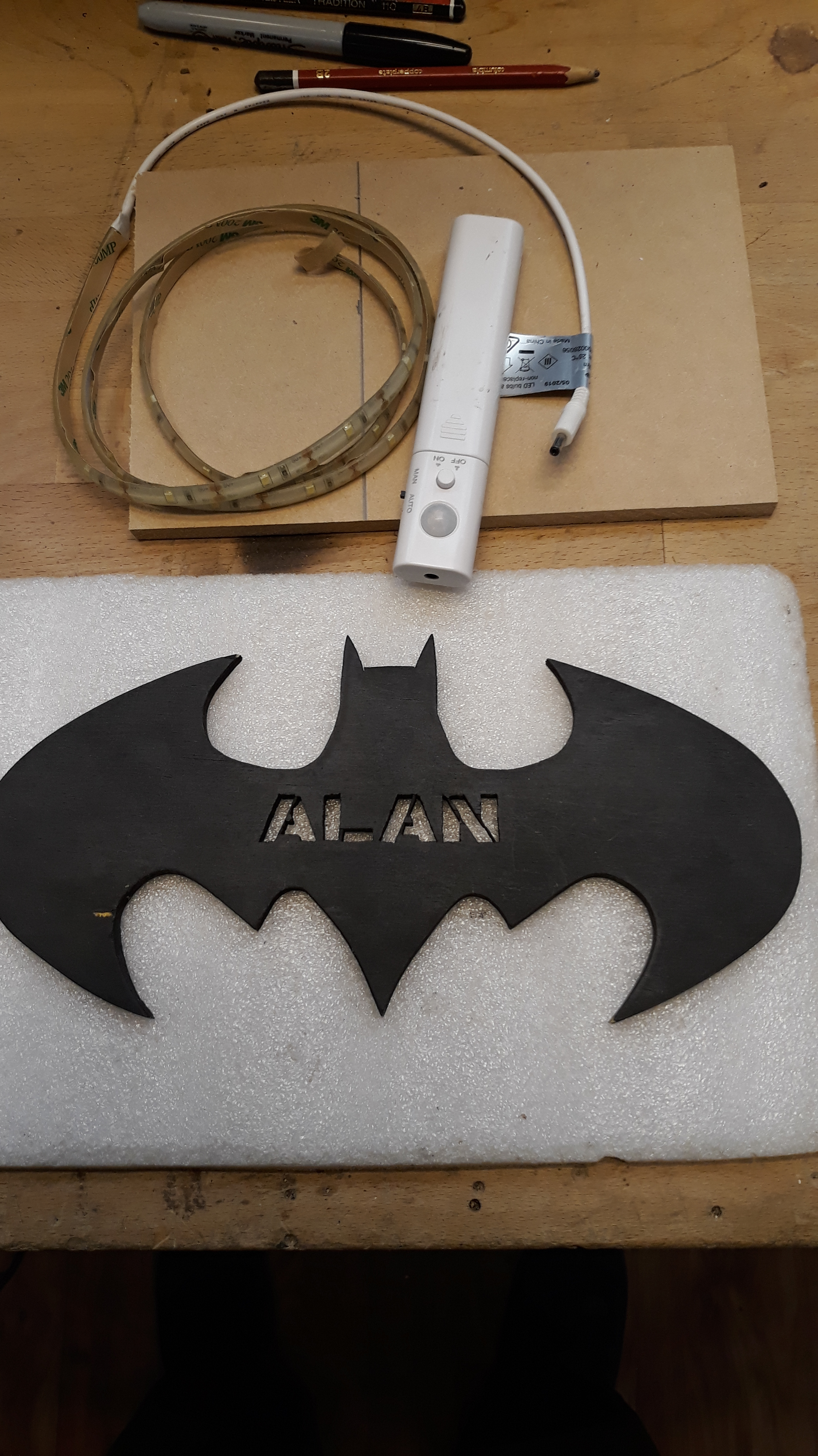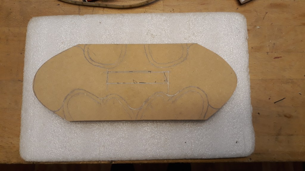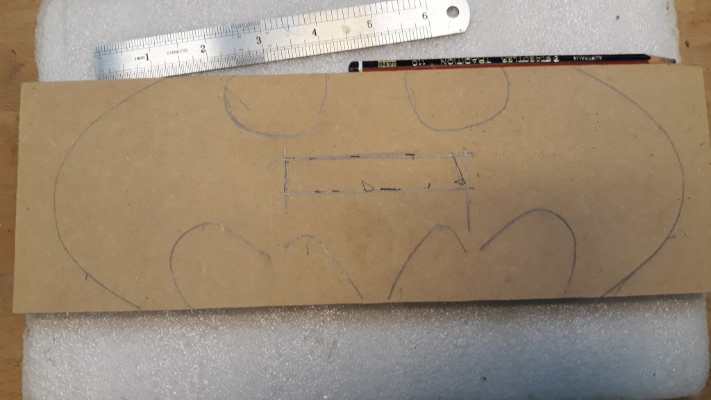 I need to make a MDF middle layer panel to support the LED strip (on edge) right the way around the bat and then back inside to illuminate the name itself. The size of that MDF blank is OK so here we are tracing the outline.