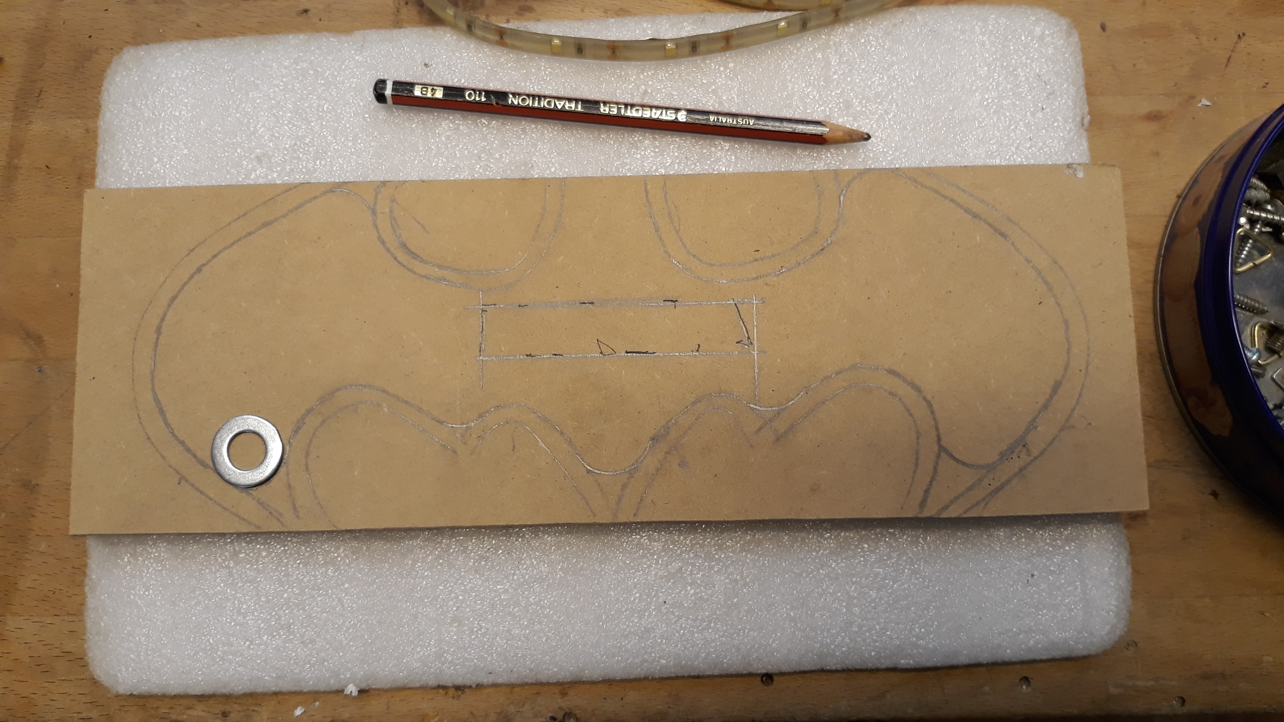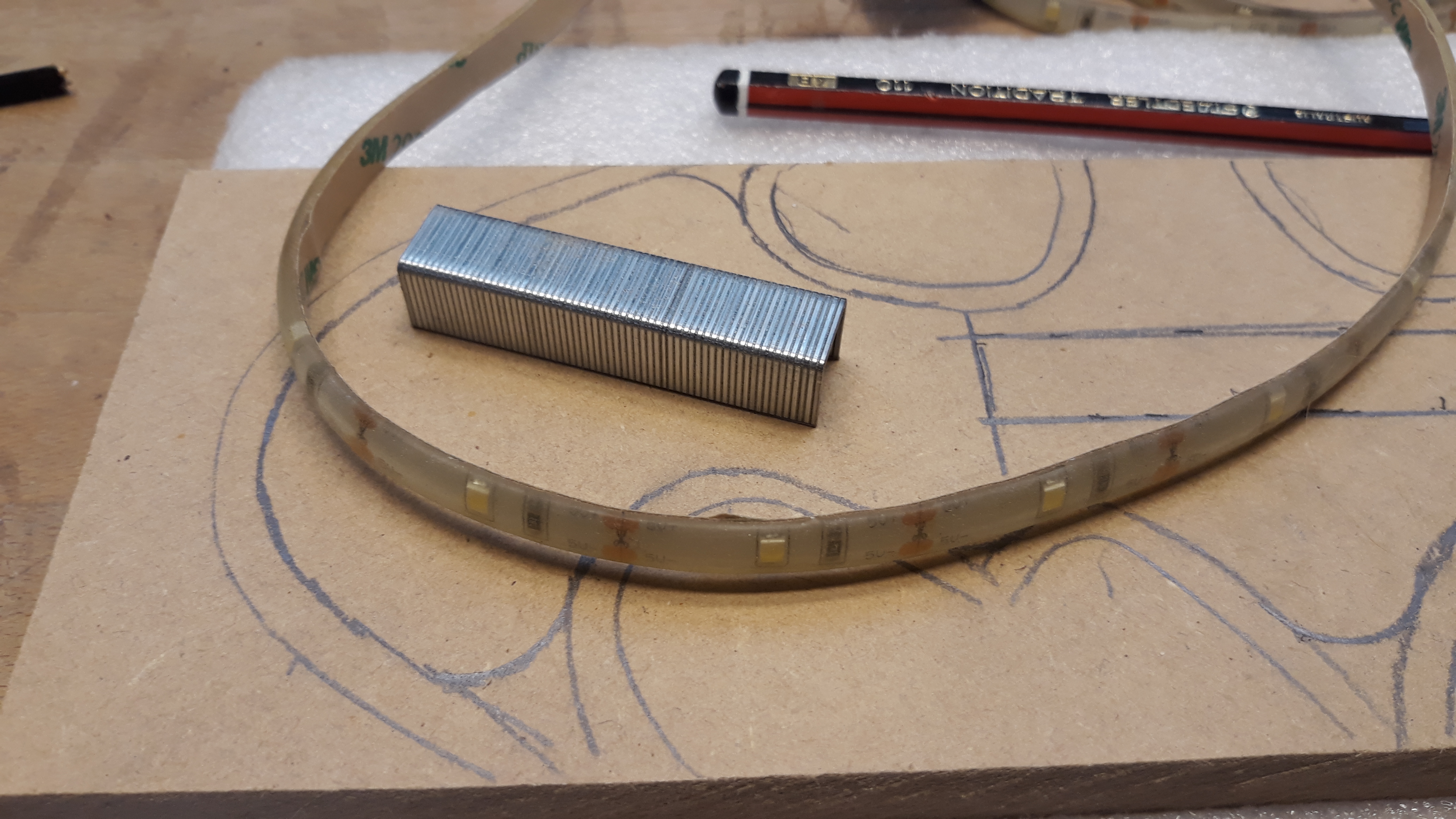 The LED strip needs to be recessed about 5mm back from the edge of the front panel so just freehand those lines following the profile and use a washer to close in the ends to form the curves.
