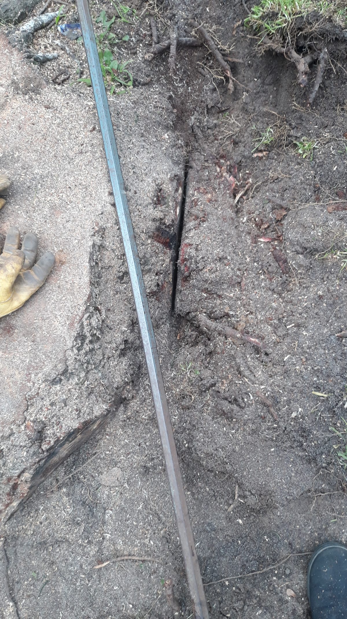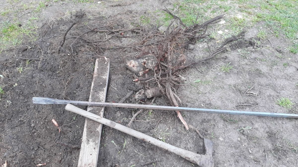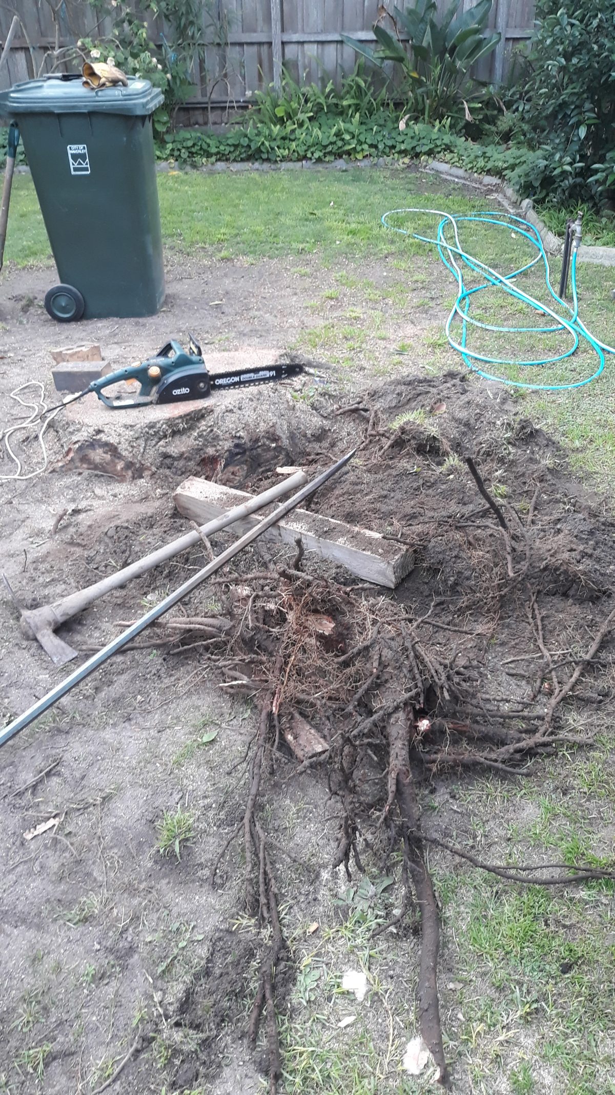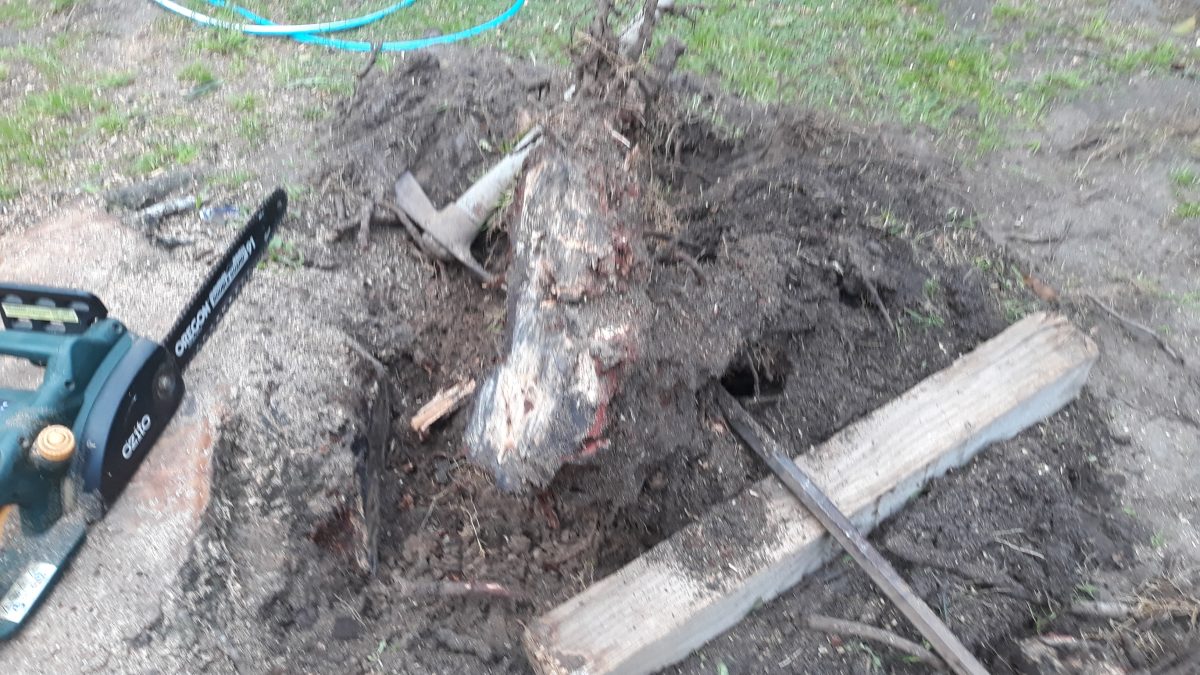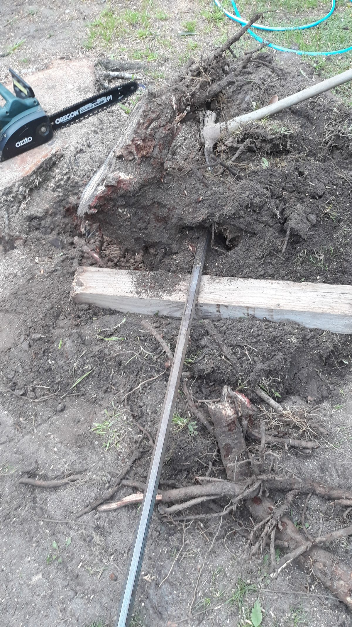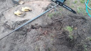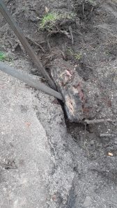 Coming across some big roots that are to hard to dig out with the crowbar so went and got – the chainsaw.