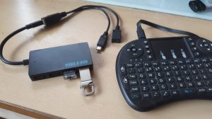 OTG USB-A cable end is plugged into a Kmart USB 3.0 4 port hub. It’s impressive how well these hubs work for the price – $10. I’ve had issues with more expensive hubs and replaced them with one of these – problems fixed.
