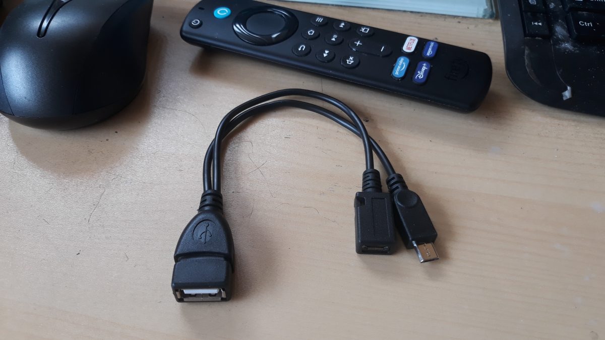 OTG USB-A cable end is plugged into a Kmart USB 3.0 4 port hub. It’s impressive how well these hubs work for the price – $10. I’ve had issues with more expensive hubs and replaced them with one of these – problems fixed.