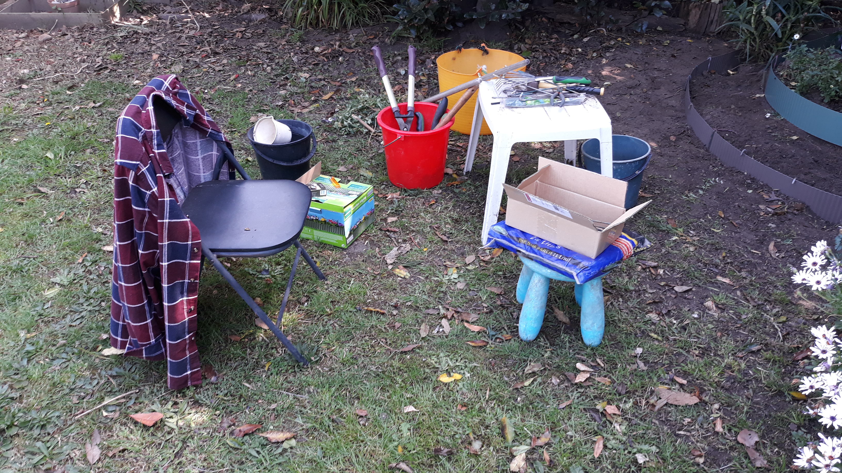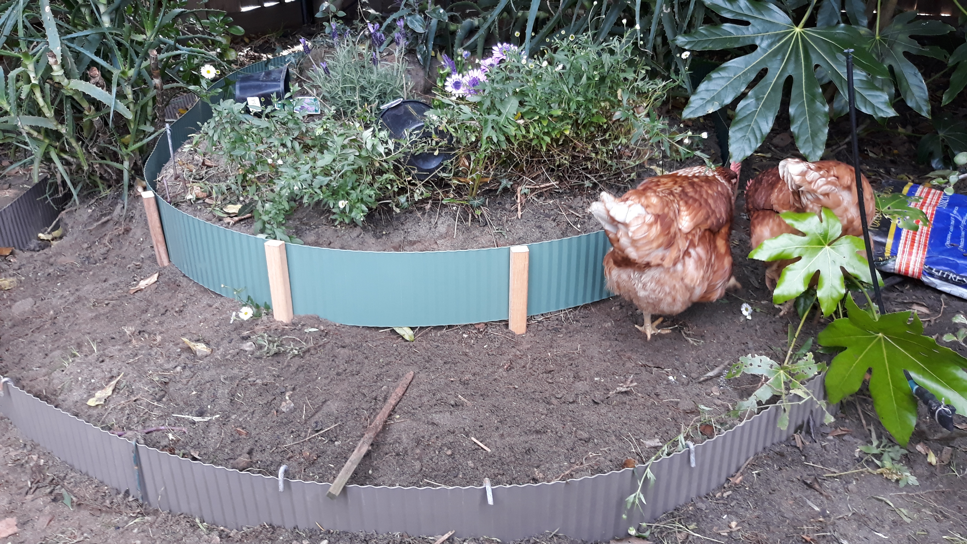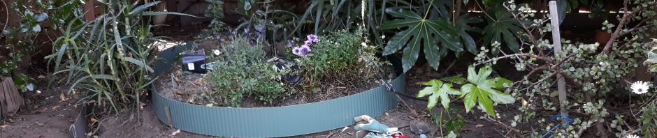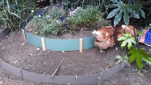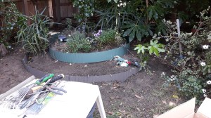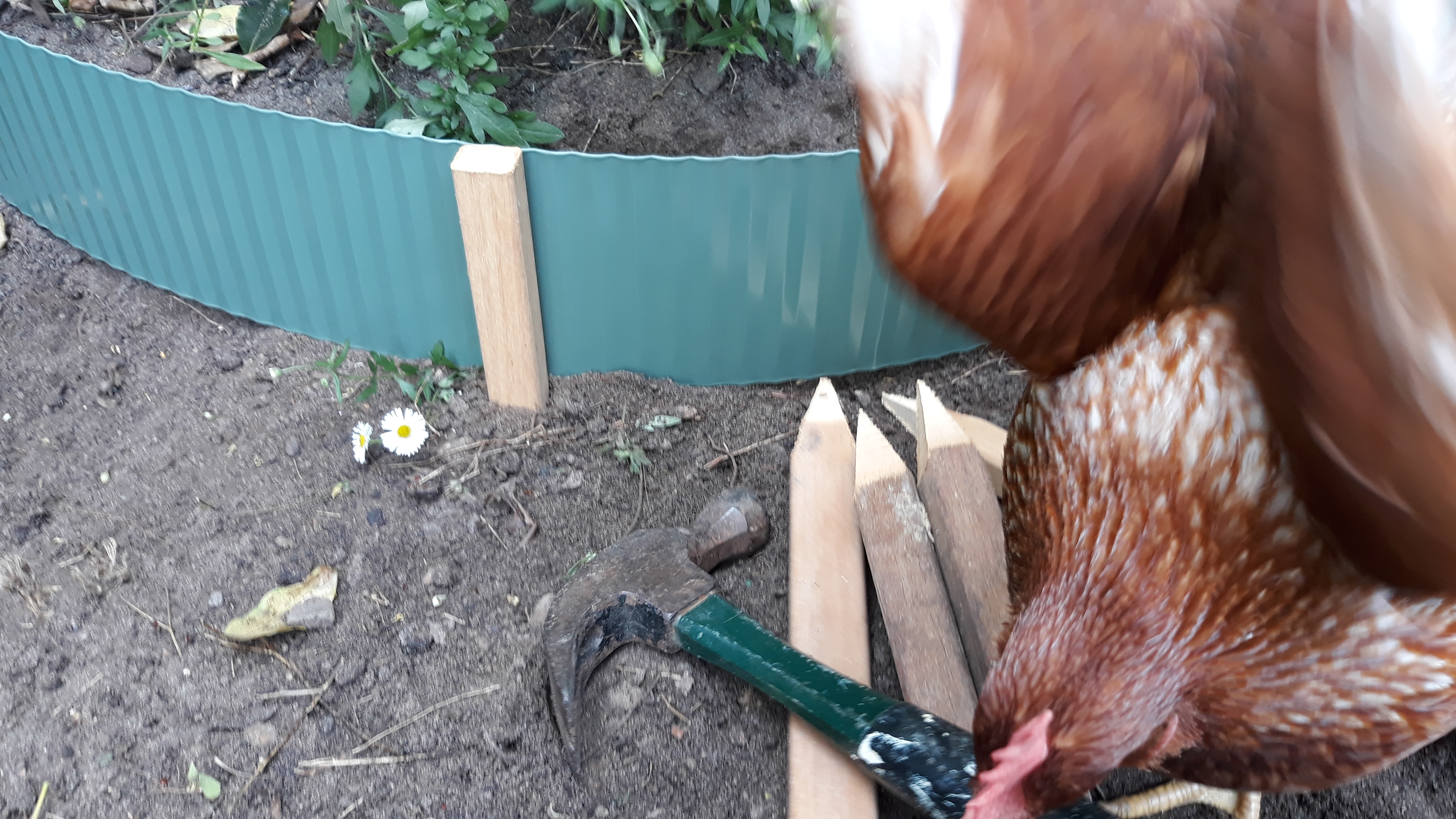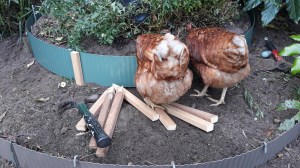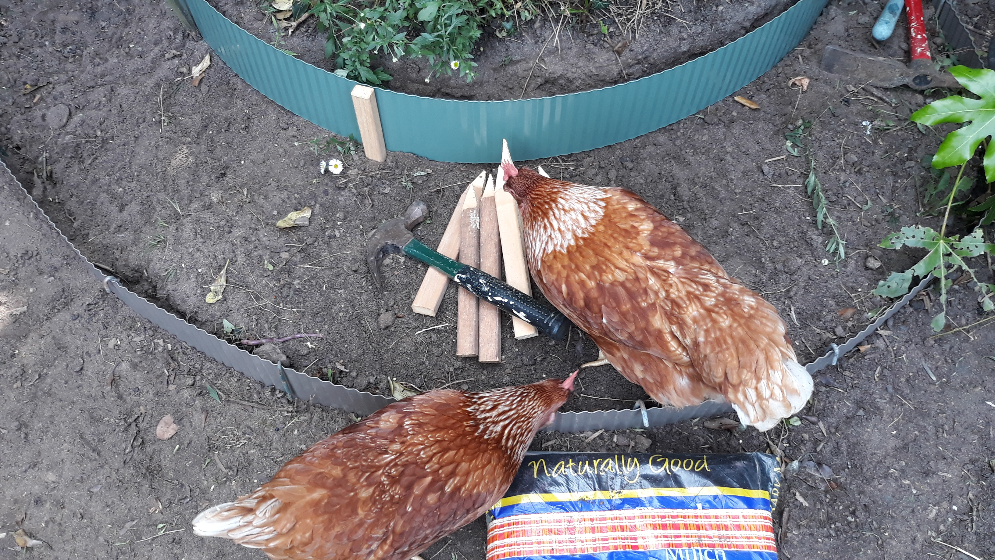 Running out the top tier edging, need to trench out some more around to the right. After doing that I started to hammer in the pegs but they won’t hold. I need to make some garden stakes.