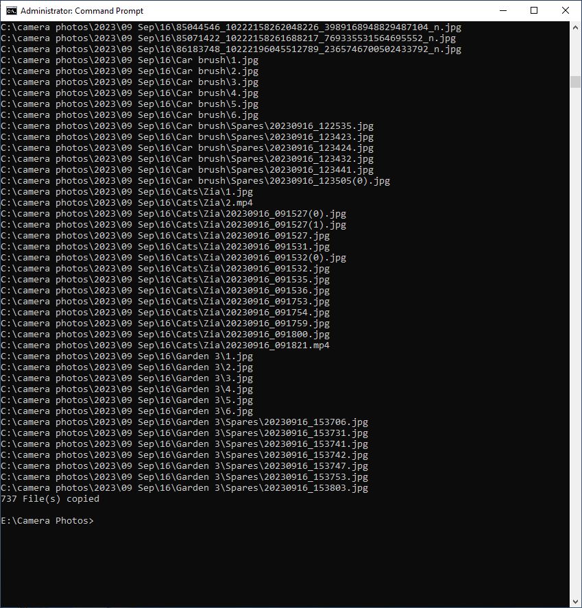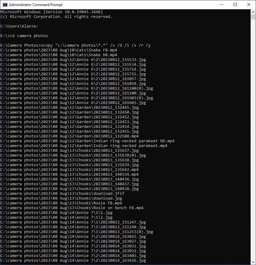 Backing up the September camera photos folder using the Xcopy command with specific switches.