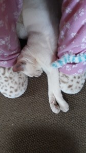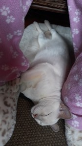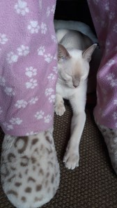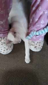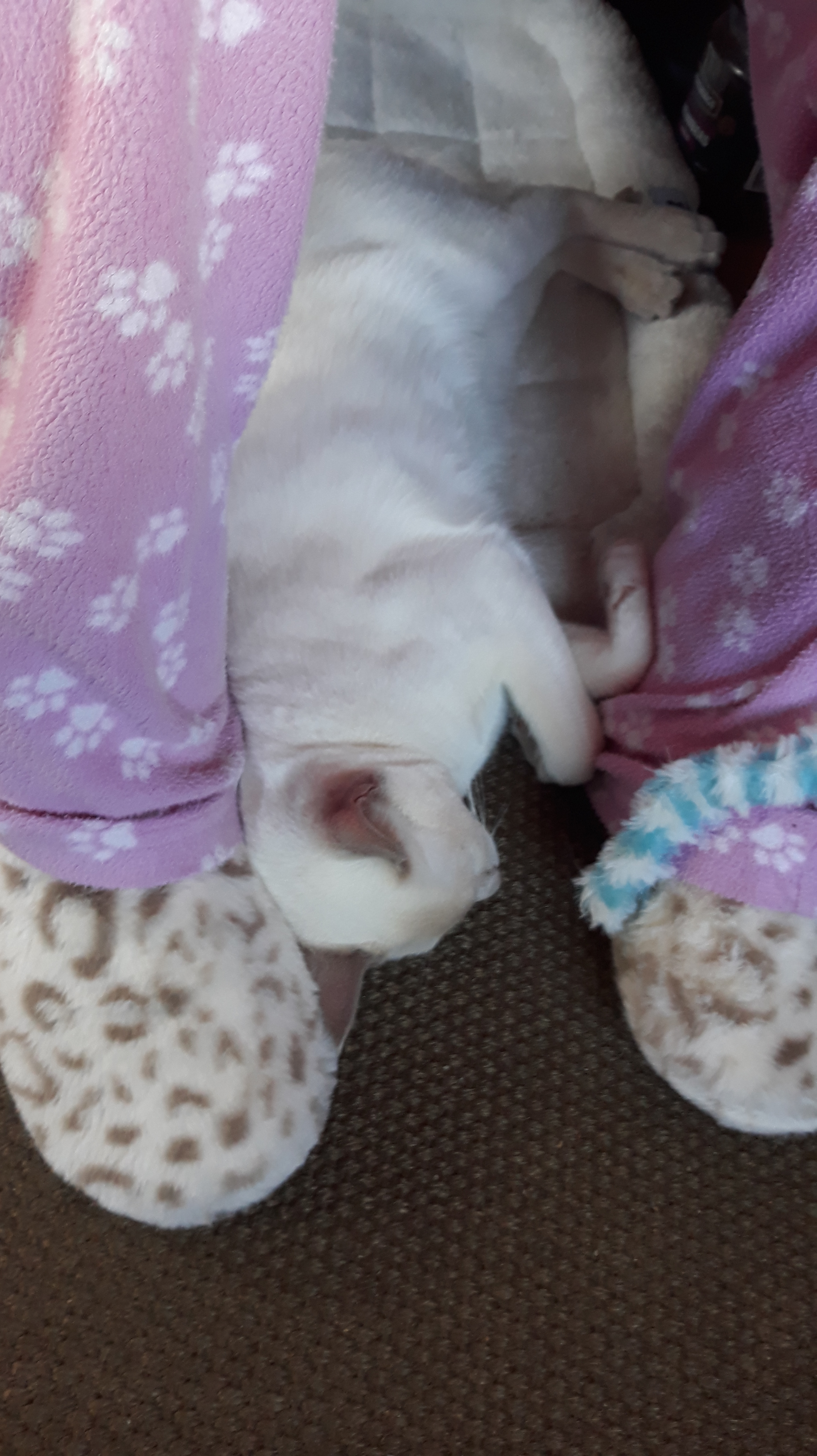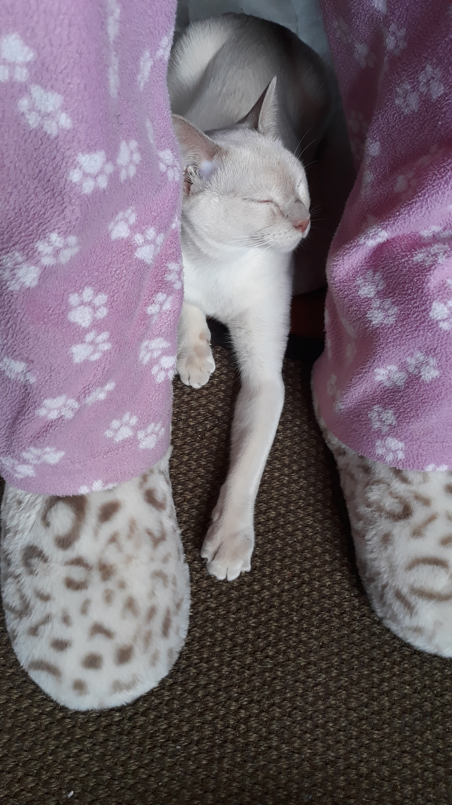 Bailey in one of his fav spots, under ET’s chair on his pad with fan heater warm air on his back.