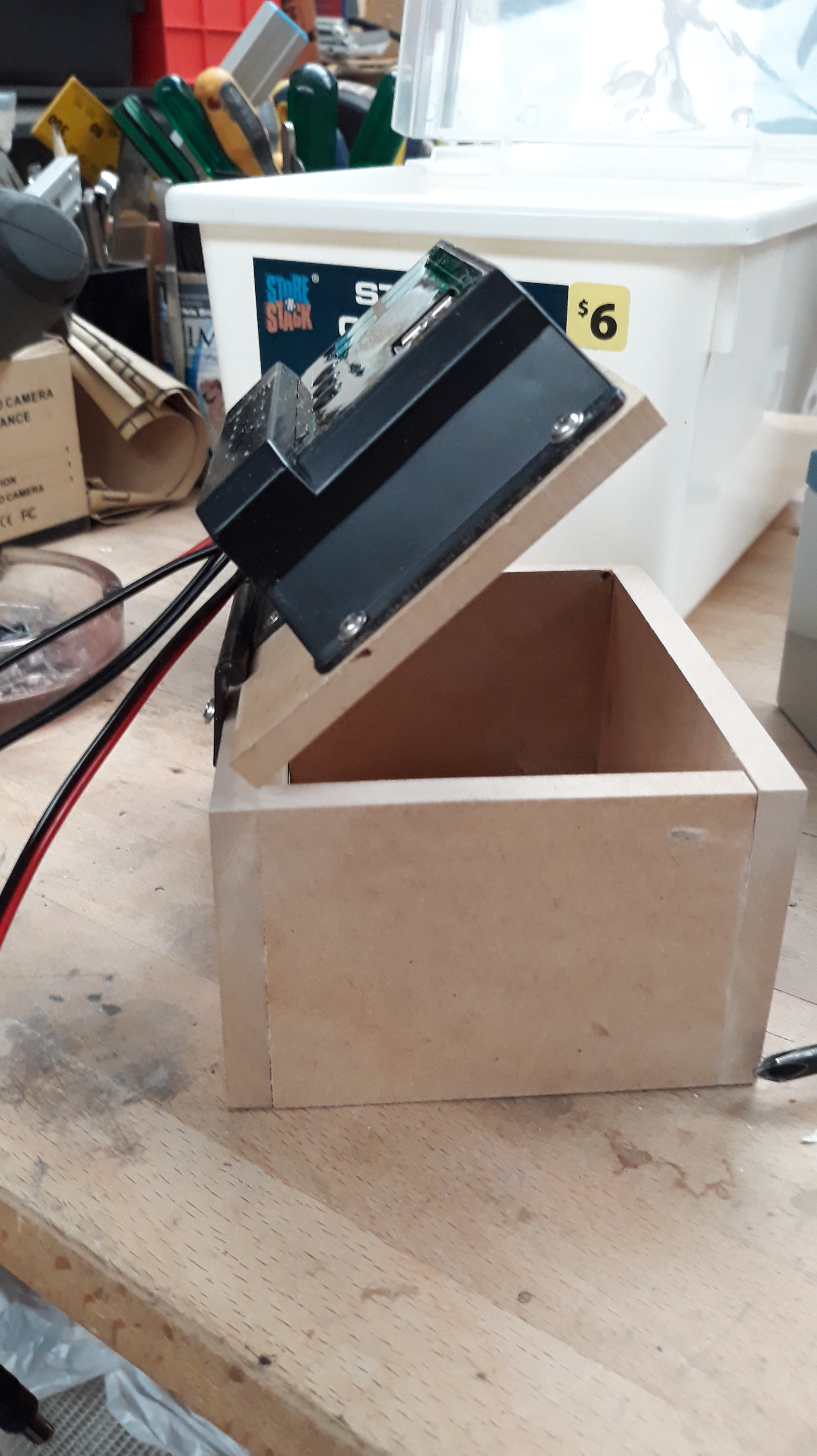 For better visibility modified the MDF box for a tilting display so I can adjust the angle to reduce sun reflections.
