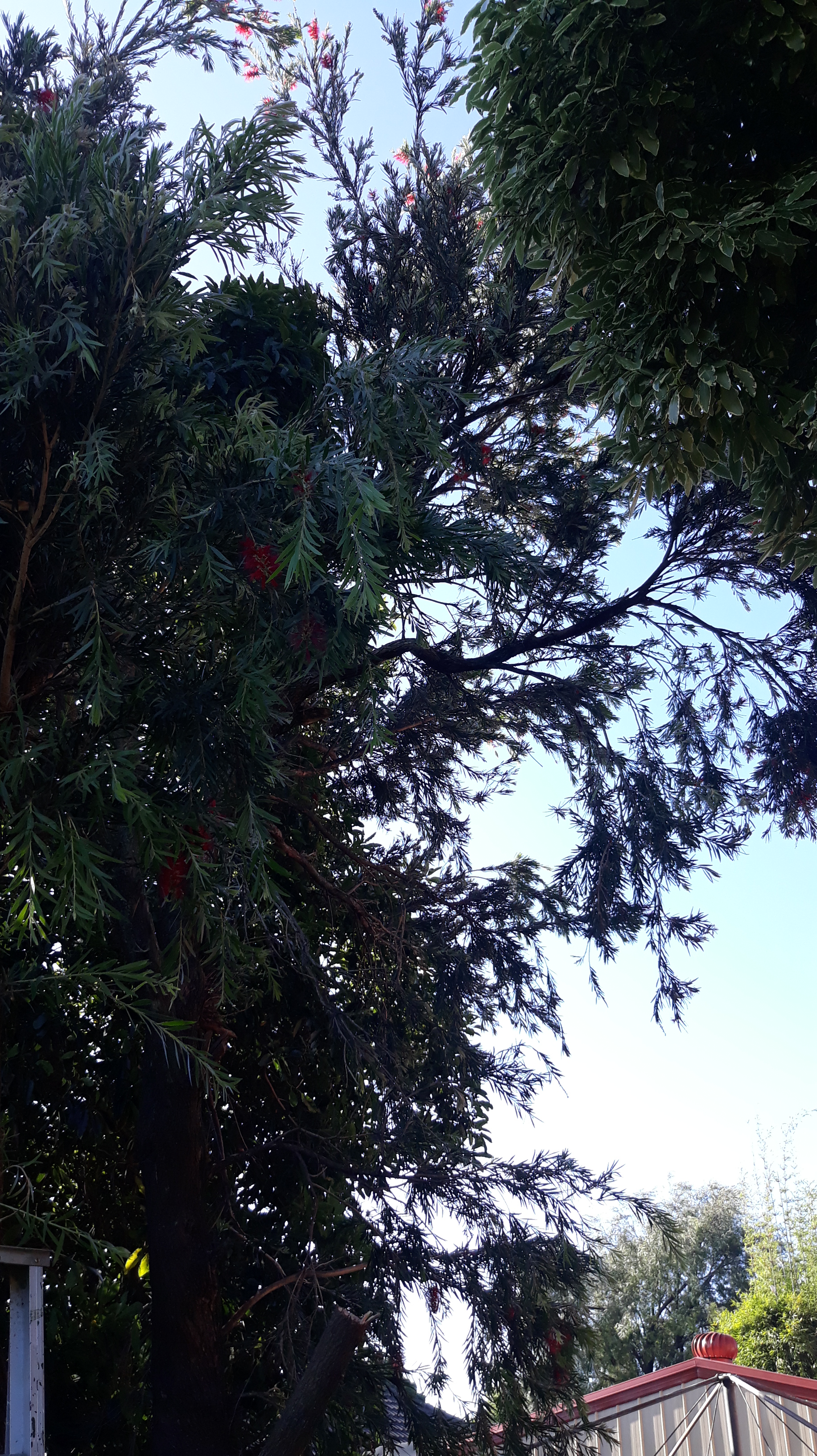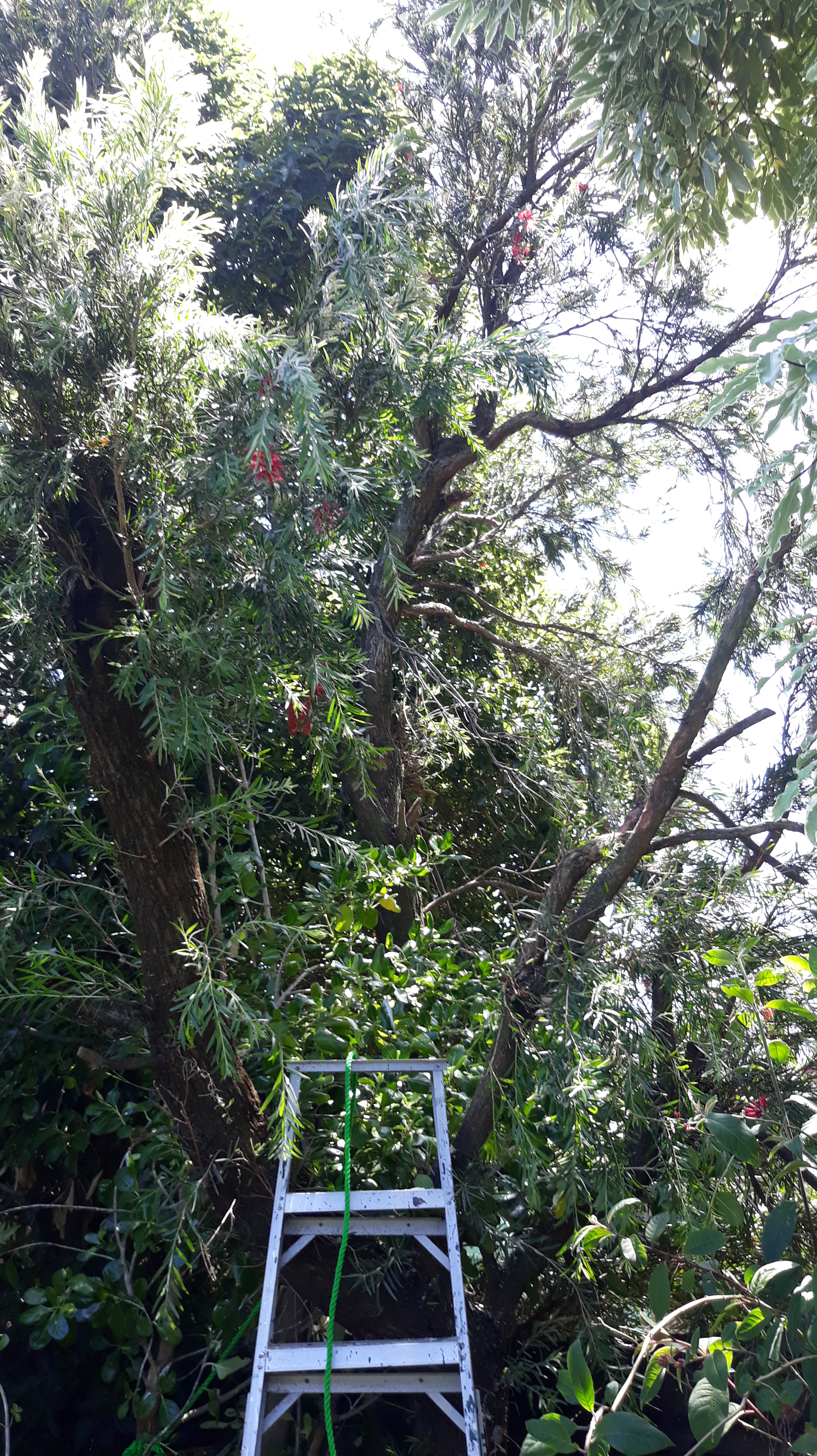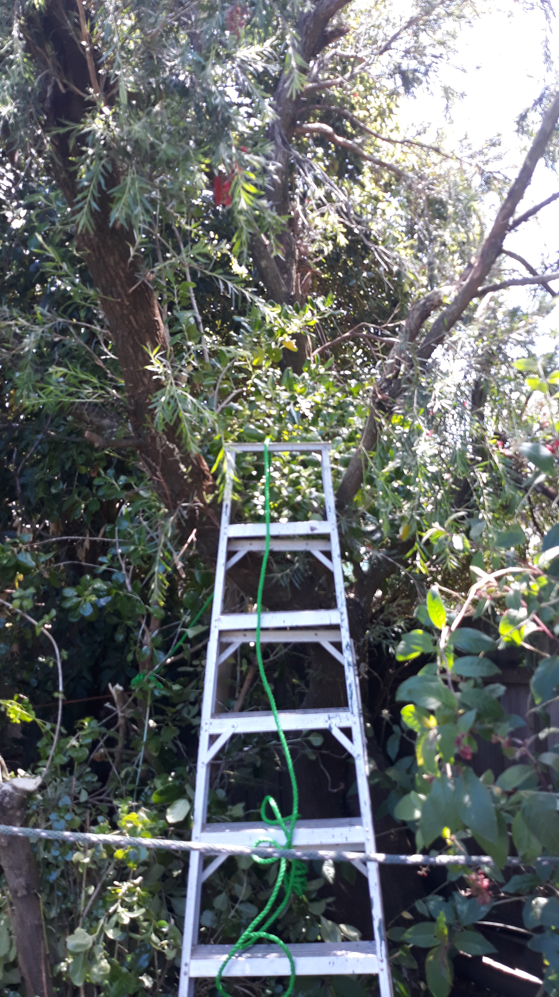 Took a while to lop the shrubs so I could get the large step ladder against the tree on this side, and later the extension ladder. About to do the same on the left so we have another angle of attack.