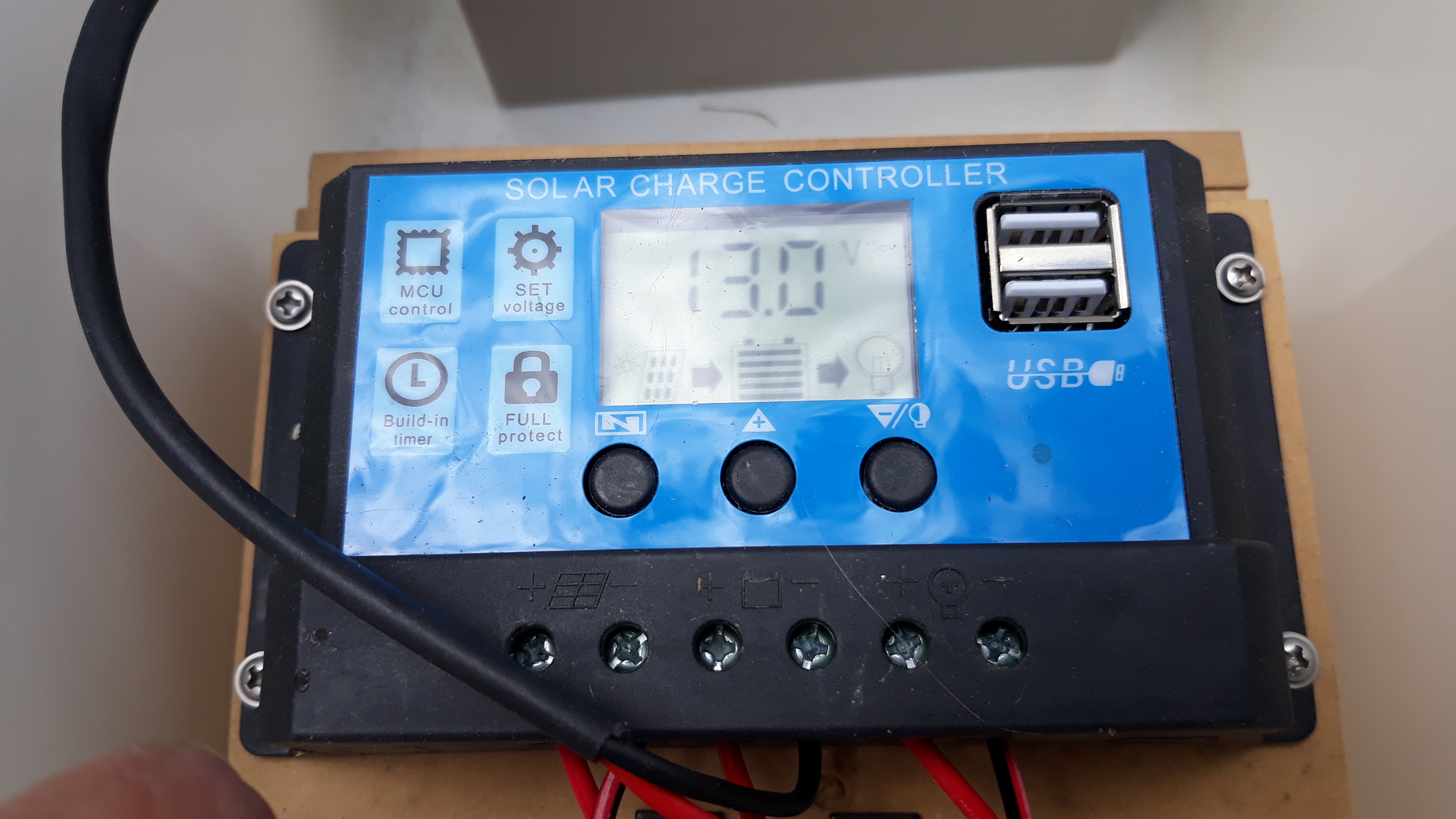 Controller is screwed to the hinged top of the mounting box and connected to a 12V SLA battery.
