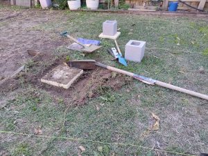 We are doing the back right pad and using the poly roofing sheet to ensure things are square.